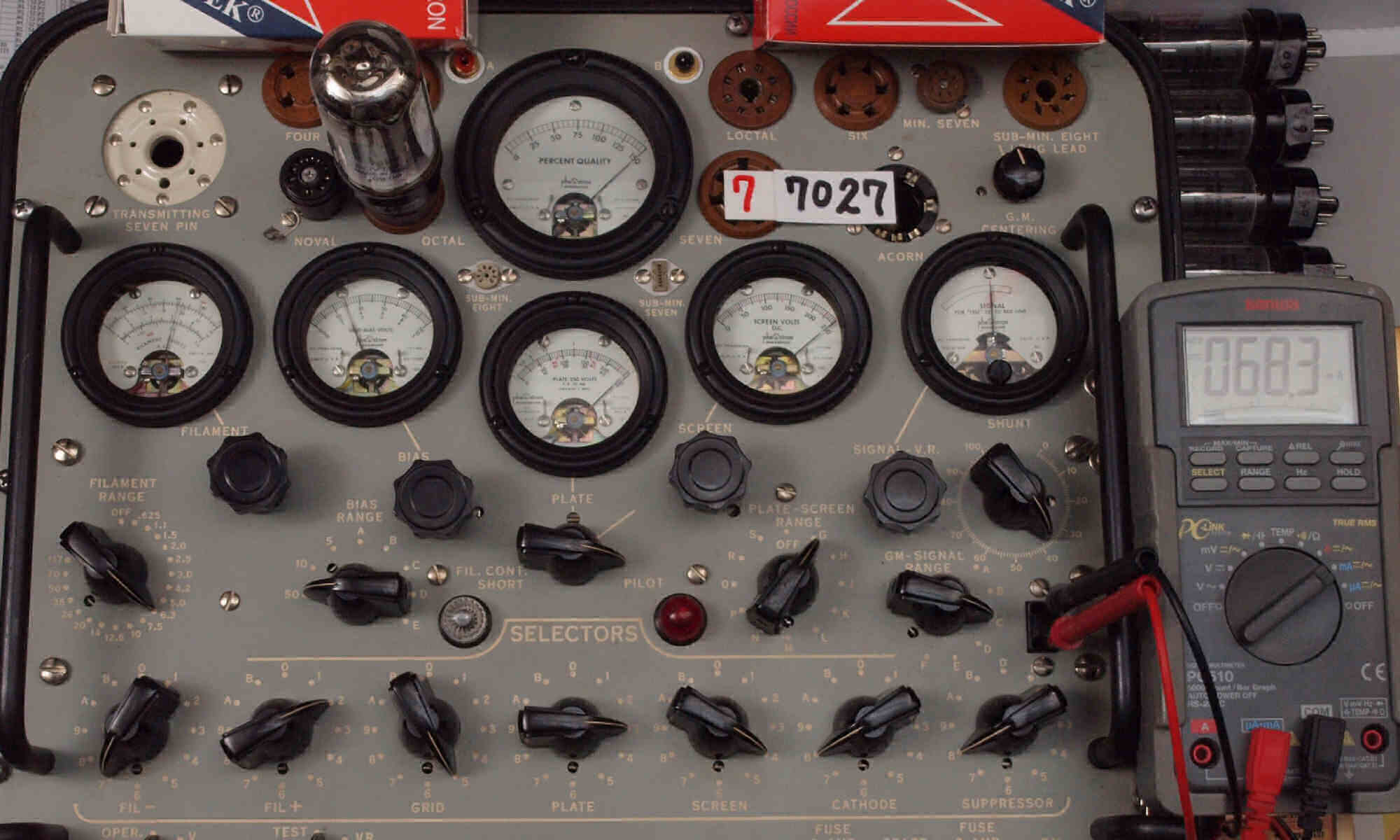 | V84. 購入真空管「7027」4本目測定。 Gm=7500μmho、Ip=68.3。 測定条件、「Ep=250V、Esg=250V、Eg1=−14V」、Cレンジ=7500μmhoレンジでの測定。 |