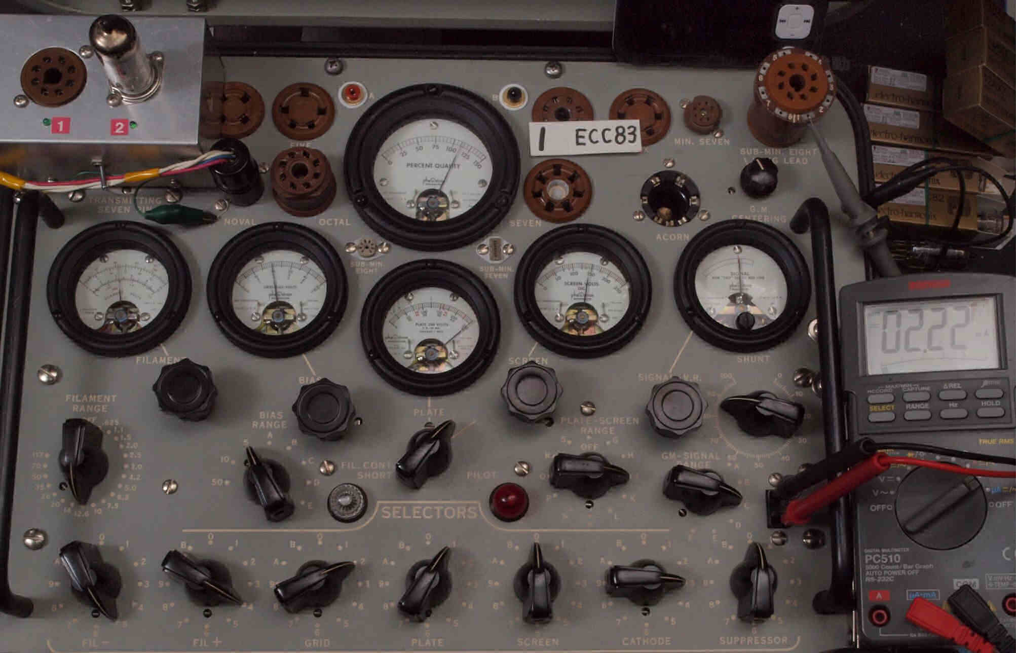 | U5. 付属真空管「12AX7(ECC83)」。 左から1本目.2本目.3本目。 真空管ハンドブック(規格表)の相互コンダクタンス=1600μmho「Ep=250V、Ip=1.2mA、Eg1=−2V」 1960/1962/1964/1966ナショナル真空管ハンドブック、1995オーディオ用真空管マニアル、60/62/69東芝電子管ハンドブック、1962日立電子管ハンドブック、1965/1971全日本真空管マニュアル、RC15/19/26/27/28/29/30 Receiving Tube Manual、1966実用真空管ハンドブック、1995世界の真空管カタログより。 |