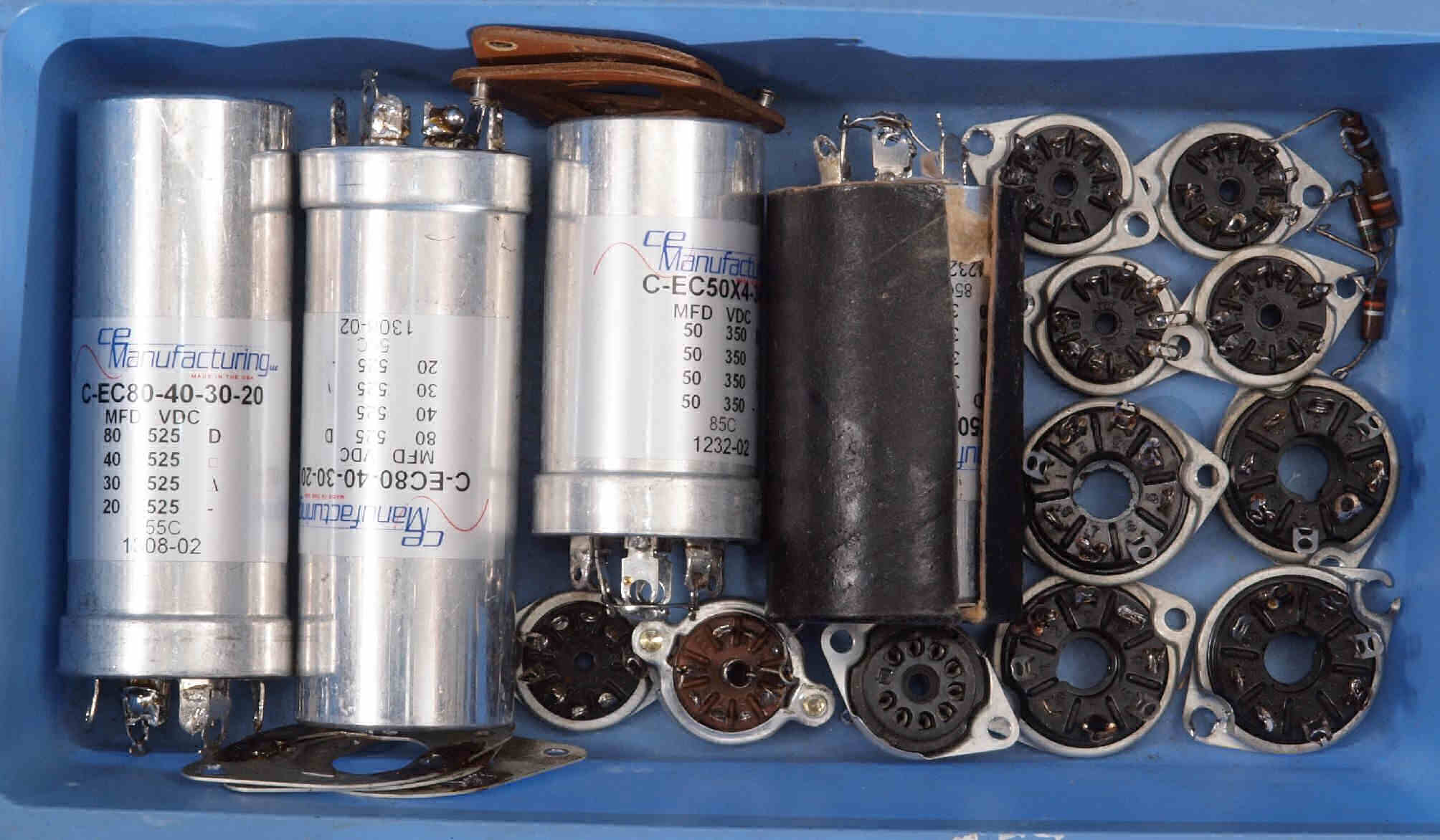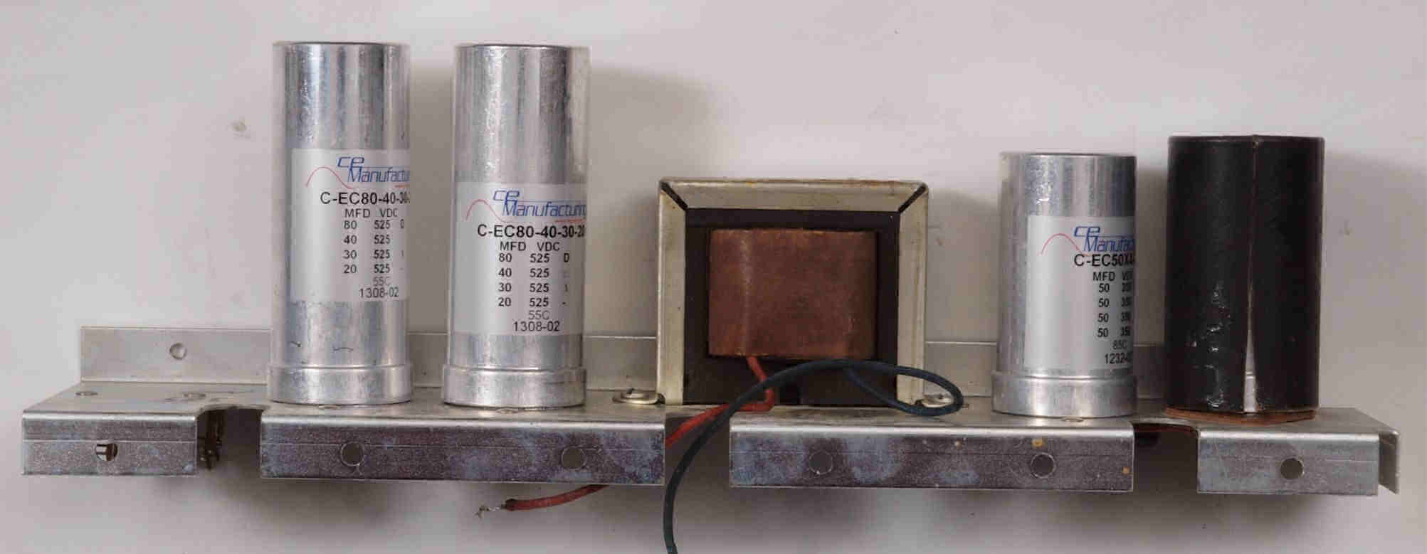 | A41. 点検中 倍電圧整流に使用する電解コンデンサー。 下記から選択可能。 左から 1000μ/250WV、 1250μ/360WV、 900μ/380WV、 500μ/500WV。 付いているのは 250μ/250WV。1000μ/250WV選択。 |