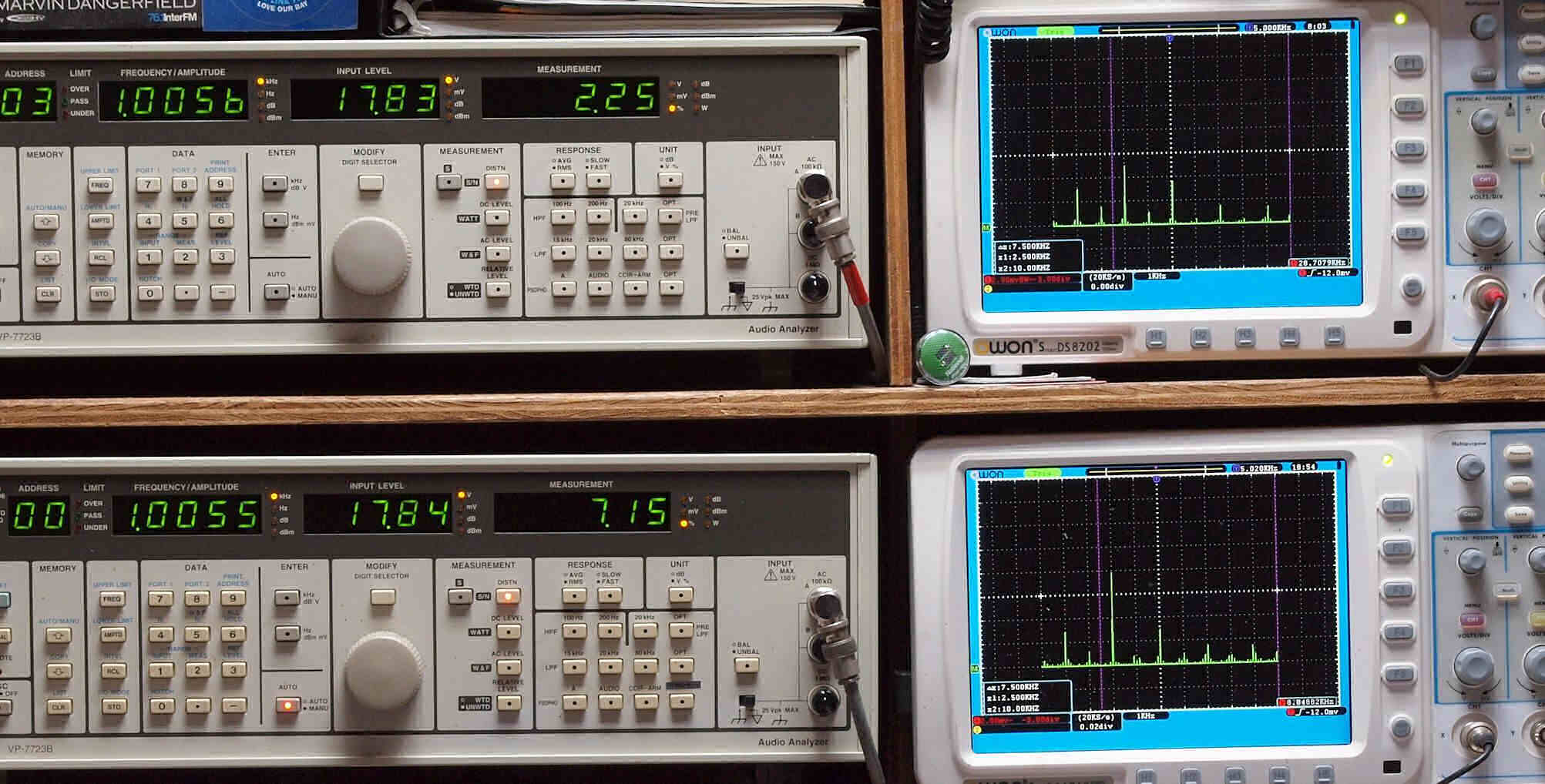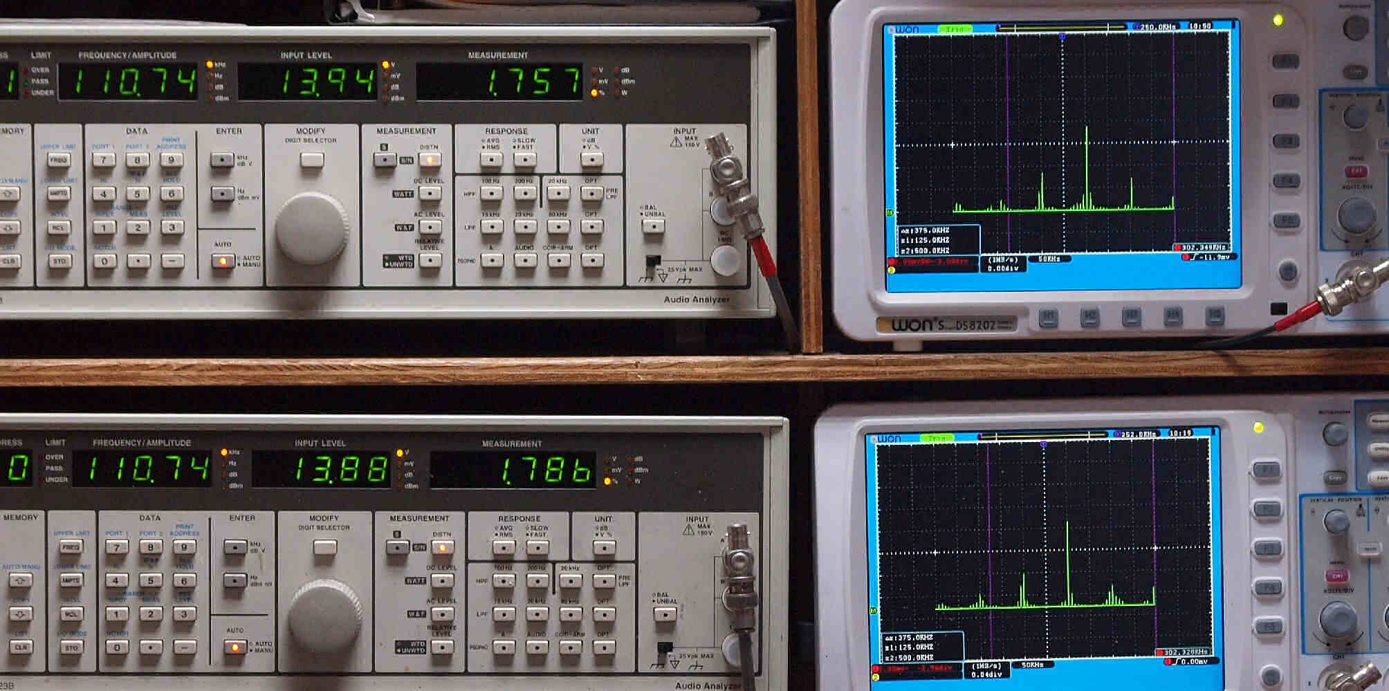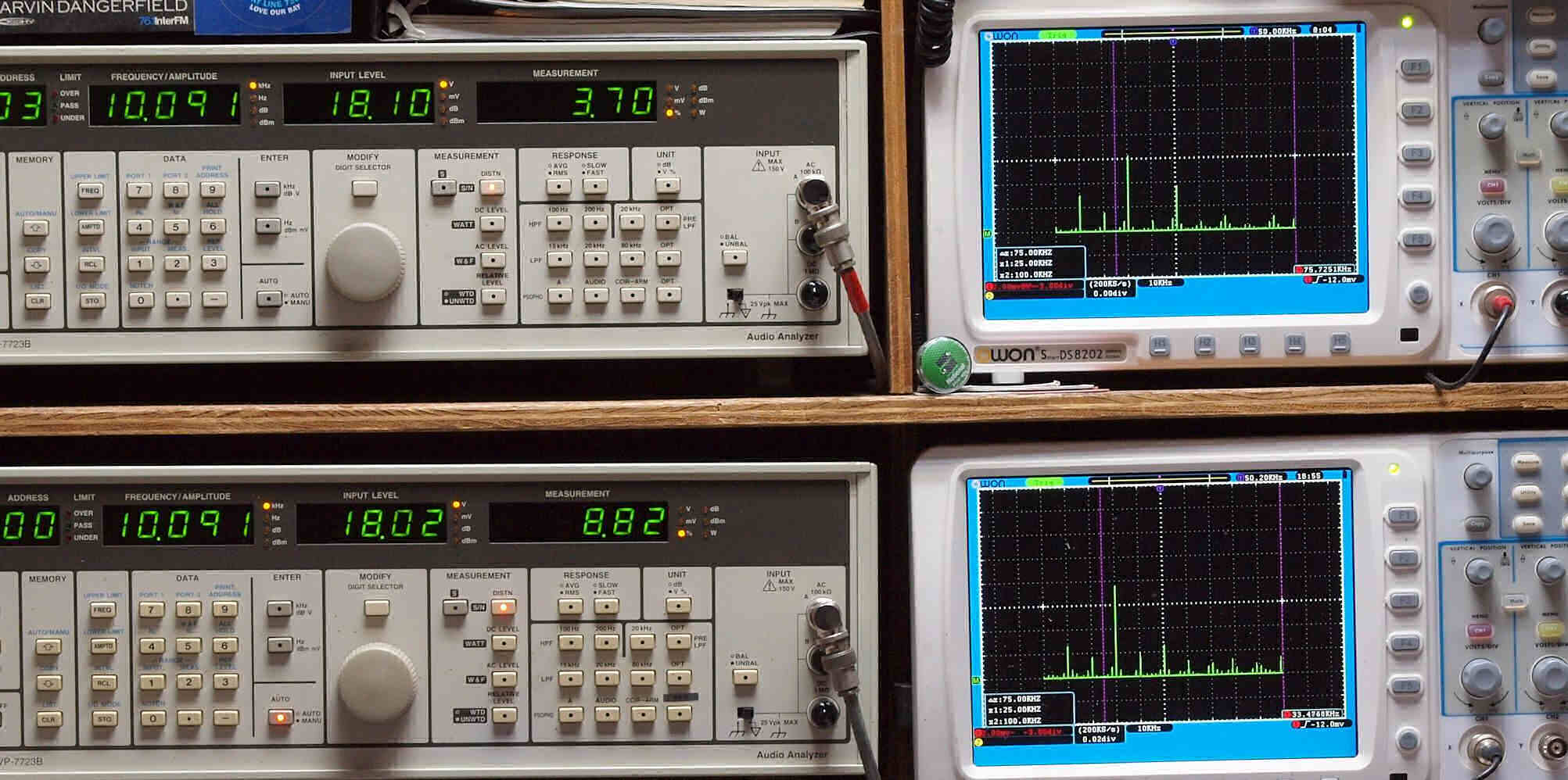 | T. 修理前の測定。 画像をクリックすると、大きく(横幅2050ドット)表示されます。 T1. 出力・歪み率測定・調整、 電源電圧=115V。 「見方」。 上段中 右側SP出力を「Audio Analyzer Panasonic VP−7723B」により測定。 表示LED、 左端=メモリーNo、 中左=周波数測定、 中右=出力電圧測定、 右端=歪み率測定。 上段右端 VP−7723Bの基本波除去出力を「owon SDS8202(200MHZ)」で「FFT分析」表示。 下段中 左側SP出力を「Audio Analyzer Panasonic VP−7723B」により測定。 表示LED、 左端=メモリーNo、 中左=周波数測定、 中右=出力電圧測定、 右端=歪み率測定。 下段右端 VP−7723Bの基本波除去出力を「owon SDS6062(200MHZ)」で「FFT分析」表示。 下段左端 オーディオ発振器 VP−7201A より50Hz〜100kHzの信号を出し(歪み率=約0.003%)、ATT+分配器を通し、AMPに入力。 よって、ダイアル設定出力レベルより低くなります。測定機器の仕様や整備の様子はこちら、「VP−7723B」「VP−7201A」。 FFT画面の見方はこちら。 |