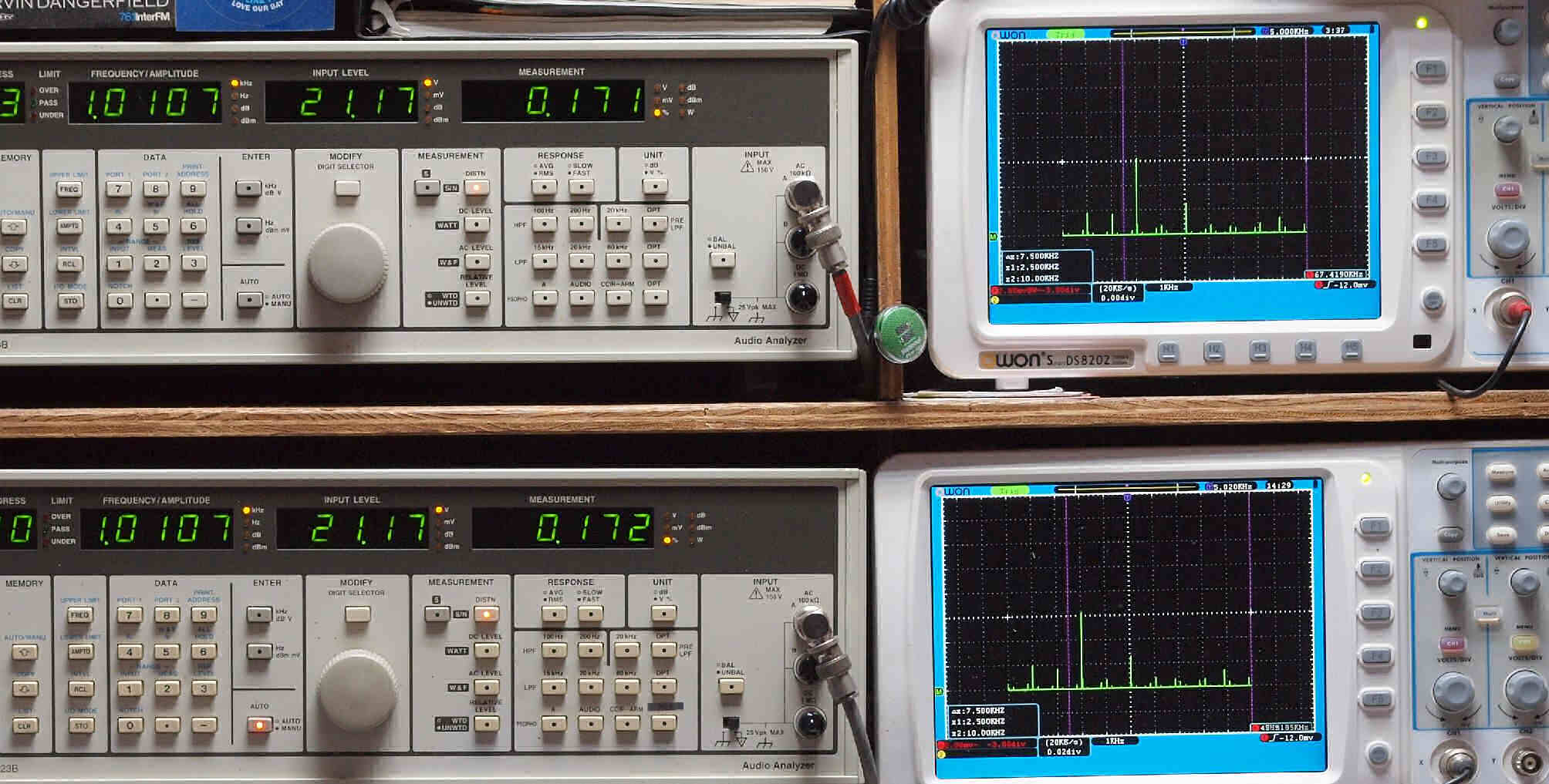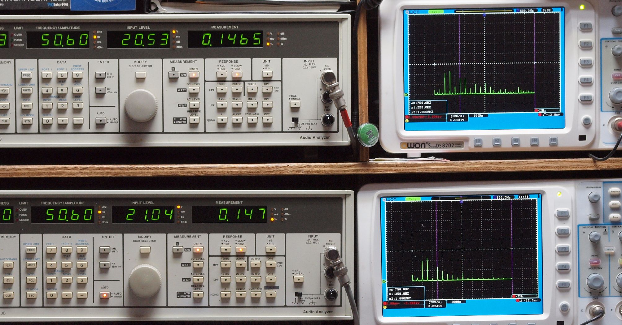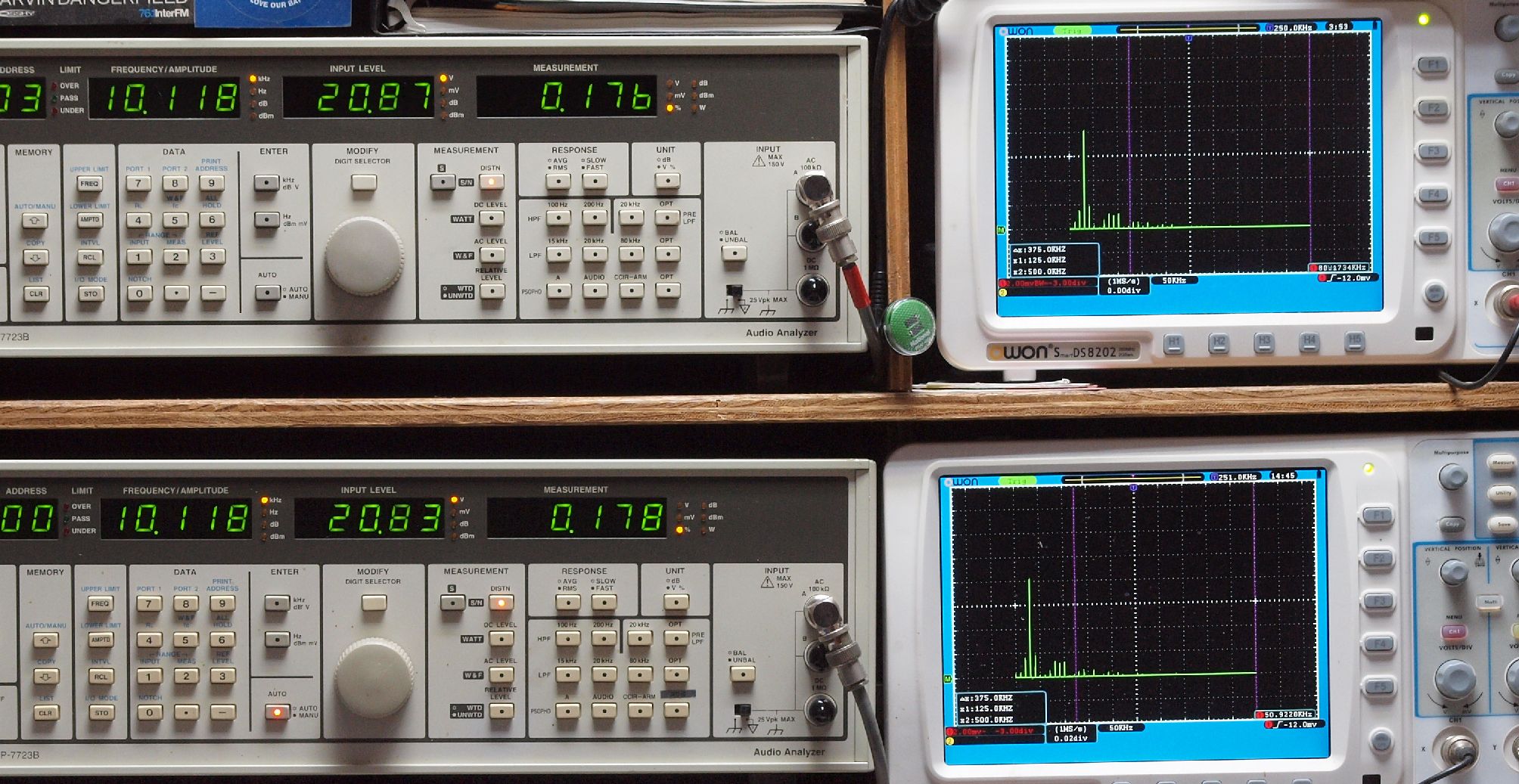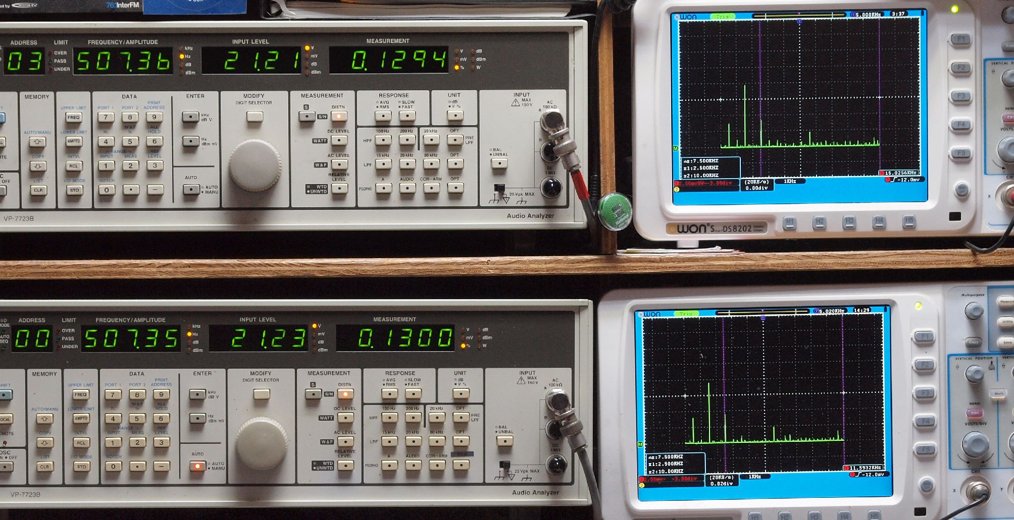 | T. 修理前の測定。 画像をクリックすると、大きく(横幅2050ドット)表示されます。 T1. 出力・歪み率測定・調整、 電源電圧=115V。 「見方」。 上段中 右側SP出力を「Audio Analyzer Panasonic VP−7723B」により測定。 表示LED、 左端=メモリーNo、 中左=周波数測定、 中右=出力電圧測定、 右端=歪み率測定。 上段右端 VP−7723Bの基本波除去出力を「owon SDS8202(200MHZ)」で「FFT分析」表示。 下段中 左側SP出力を「Audio Analyzer Panasonic VP−7723B」により測定。 表示LED、 左端=メモリーNo、 中左=周波数測定、 中右=出力電圧測定、 右端=歪み率測定。 下段右端 VP−7723Bの基本波除去出力を「owon SDS6062(200MHZ)」で「FFT分析」表示。 下段左端 オーディオ発振器 VP−7201A より50Hz〜100kHzの信号を出し(歪み率=約0.003%)、ATT+分配器を通し、AMPに入力。 よって、ダイアル設定出力レベルより低くなります。測定機器の仕様や整備の様子はこちら、「VP−7723B」「VP−7201A」。 FFT画面の見方はこちら。 |