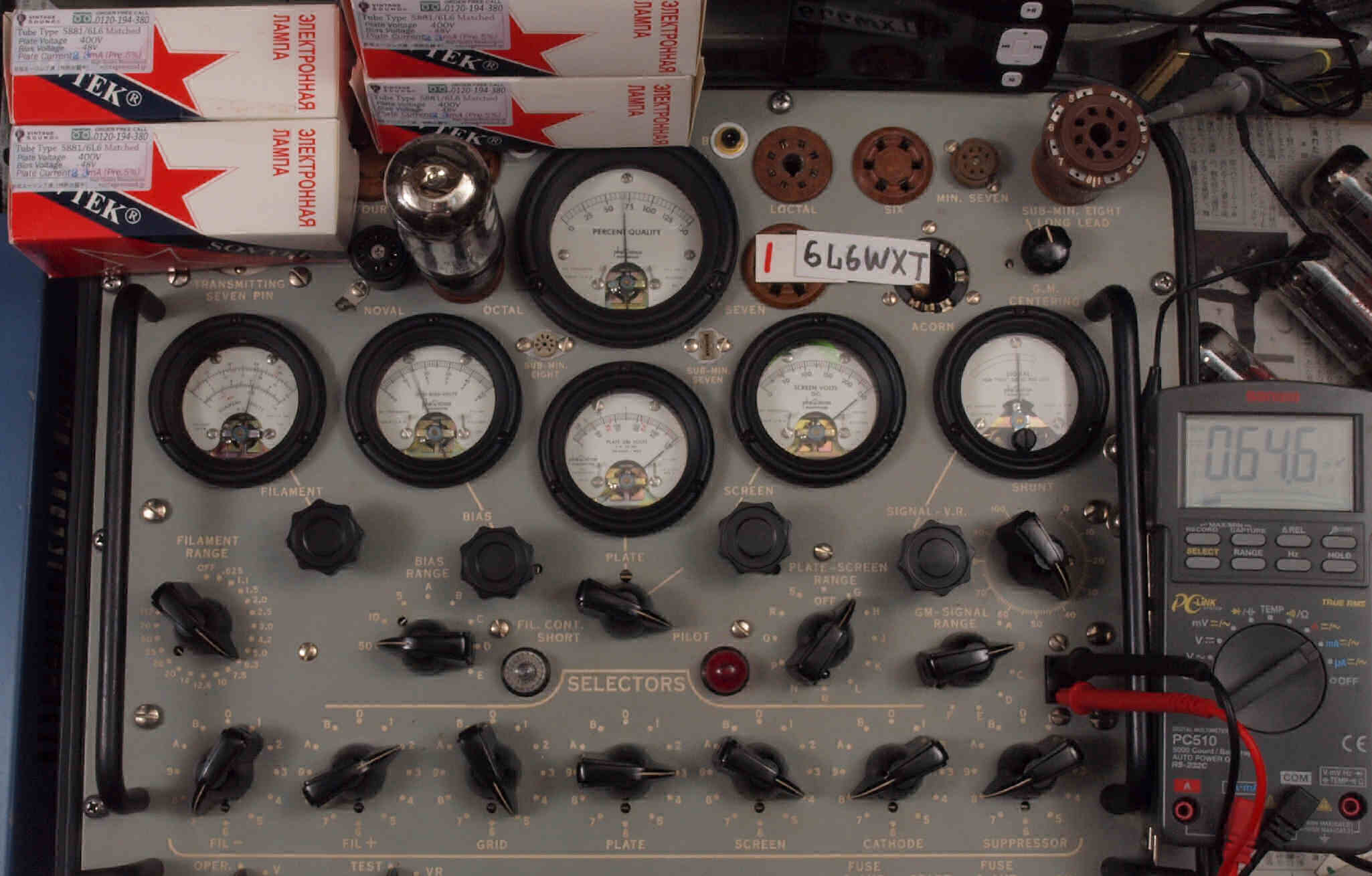 | V81. 1本目 6L6WXT 測定。 Gm=6700μmho、Ip=64.6mA。 RangeSW=B、FullScale=15000μmho。測定条件、 「Ep=250V、Esg=250V、Eg1=−14V」 |