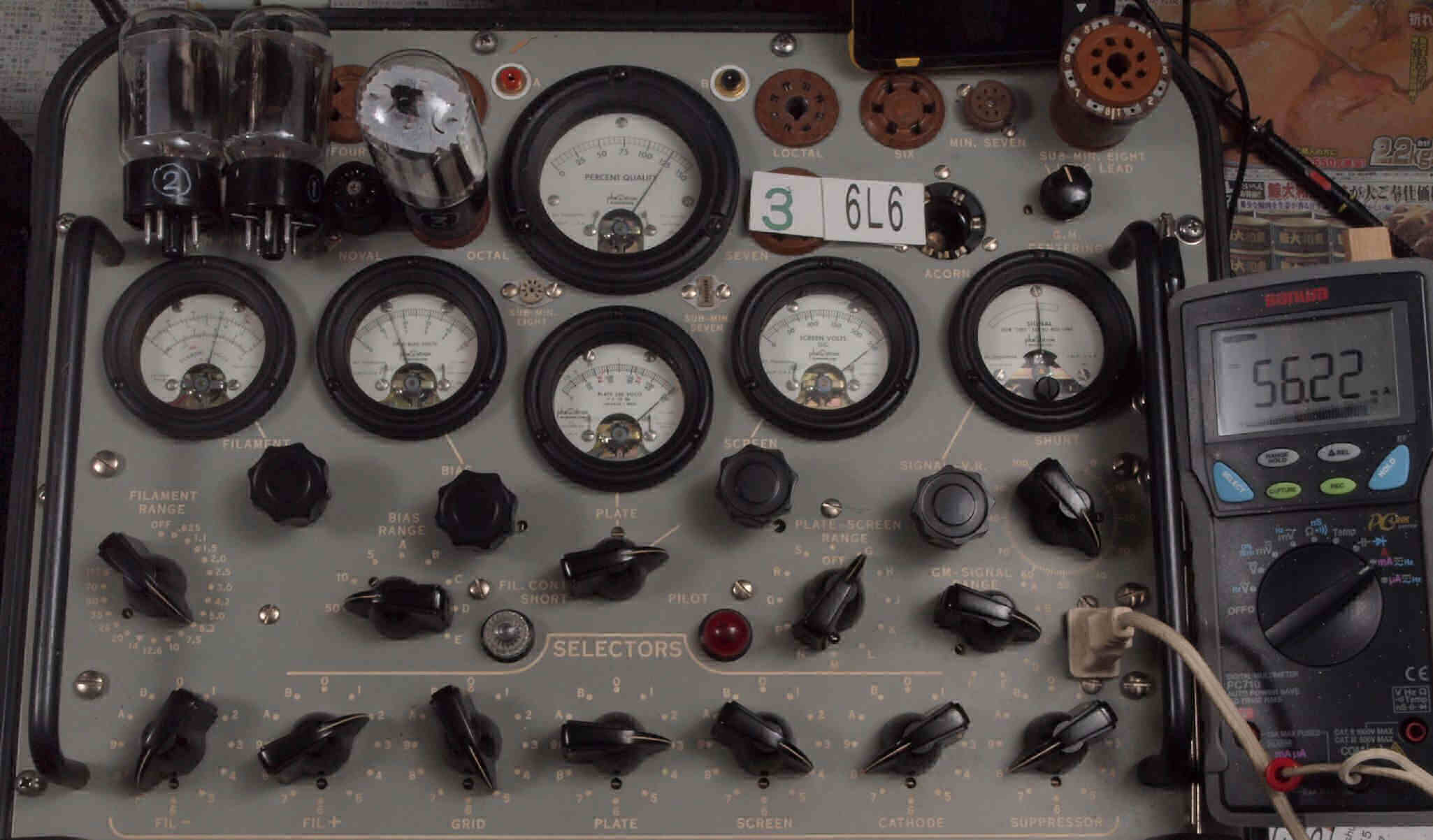 | V8. 提供真空管「6L6WXT」 左から1本目.2本目.3本目.4本目。 真空管ハンドブック(規格表)の、相互コンダクタンス=6000μmho「Ep=250V、Esg=250V、Ip=72mA、Eg1=−14V」 1960/1962/1964/1966ナショナル真空管ハンドブック、1995オーディオ用真空管マニアル、60/62/69東芝電子管ハンドブック、1962日立電子管ハンドブック、1965/1971全日本真空管マニュアル、RC15/19/26/27/28/29/30 Receiving Tube Manual、1966実用真空管ハンドブック、1995世界の真空管カタログより。 1本目 6L6WXT 測定。 Gm=6700μmho、Ip=64.6mA。 2本目 6L6WXT 測定。 Gm=6500μmho、Ip=63.5mA。 3本目 6L6WXT 測定。 Gm=7300μmho、Ip=73.1mA。 4本目 6L6WXT 測定。 Gm=6100μmho、Ip=68.6mA。 |