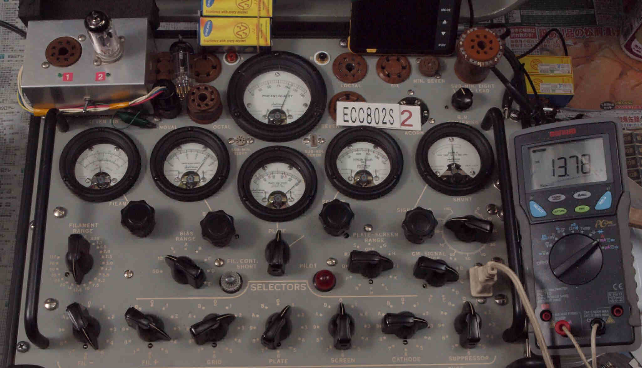 | V41. 提供真空管「ECC802S」2本目ユニット1測定。 Gm=2140μmho、Ip=13.78mA。 測定条件、「Ep=250V、Eg1=−8.5V」、 Cレンジ=3000μmhoレンジでの測定。 |