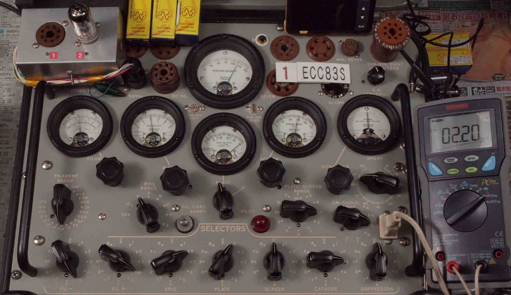 | V61. 提供真空管「ECC803S」2本目ユニット1測定。 Gm=2200μmho、Ip=1.89mA。 測定条件、「Ep=250V、Eg1=−2V」、Cレンジ=3000μmhoレンジでの測定。 |