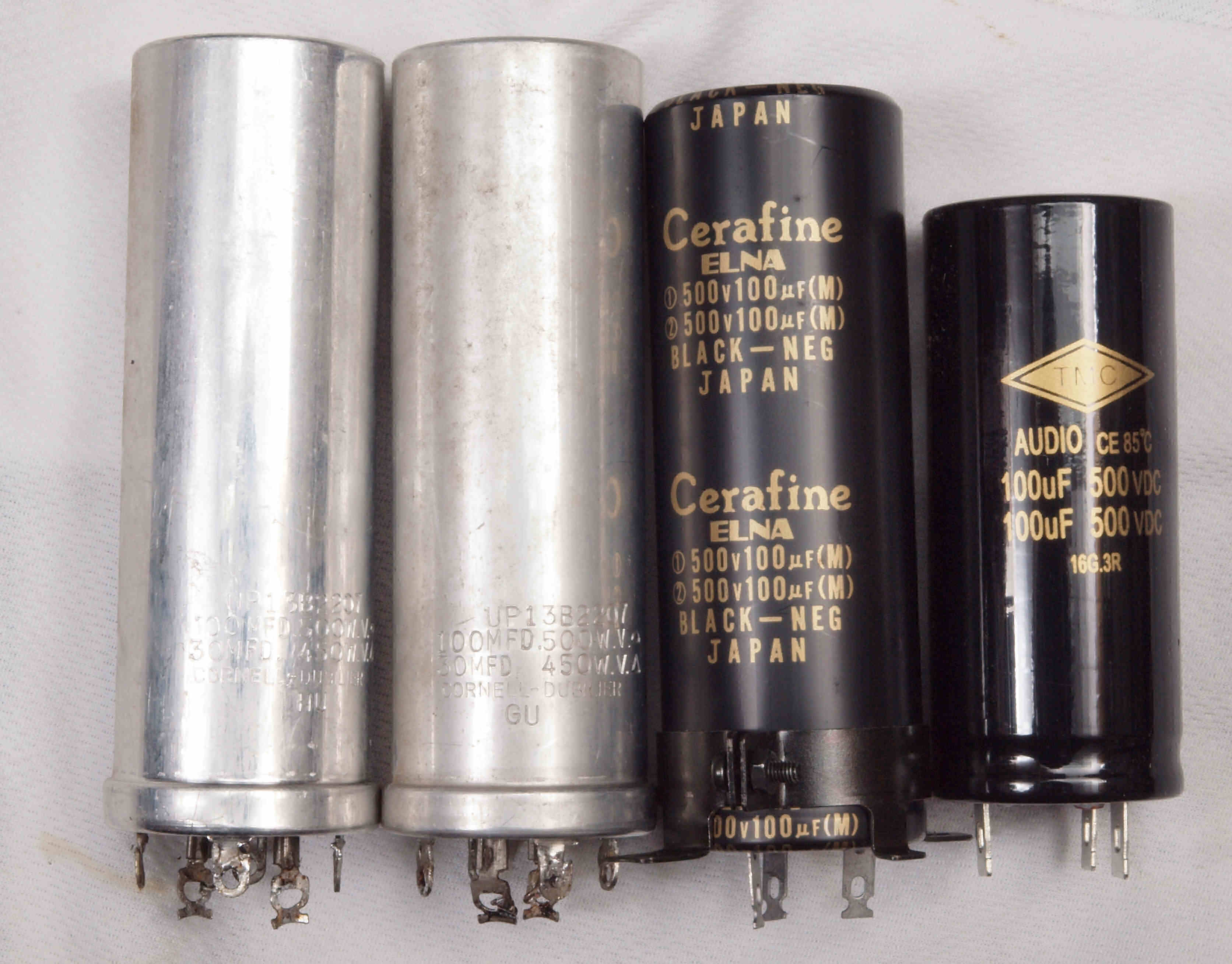 | CA2. 交換部品 交換したブロック電解コンデンサー比較。左2本=付いていた100μ/500WV+30μ/450WV、右2本=交換した100μ+100μ/500WV。 | ||||||||||||||||||||||||