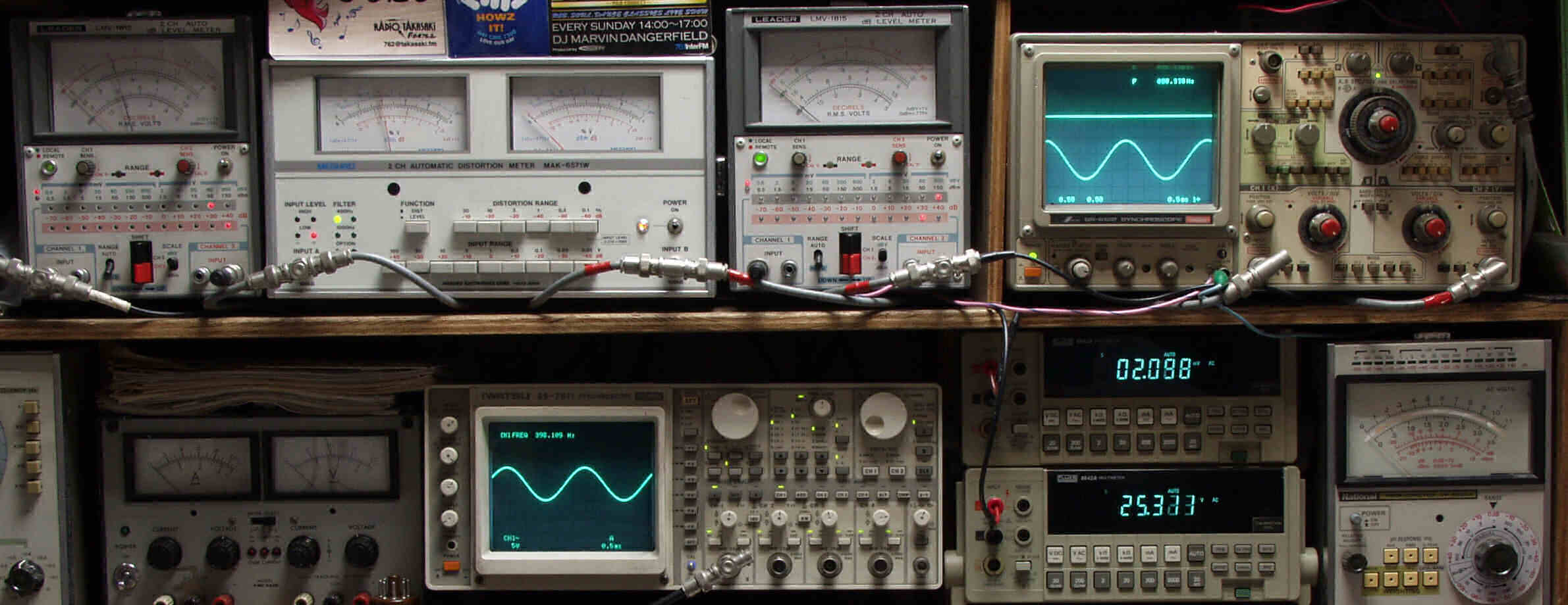 上段中左 歪み率計=SP出力の歪み率測定 左メータ=L出力、右メータ=R出力
