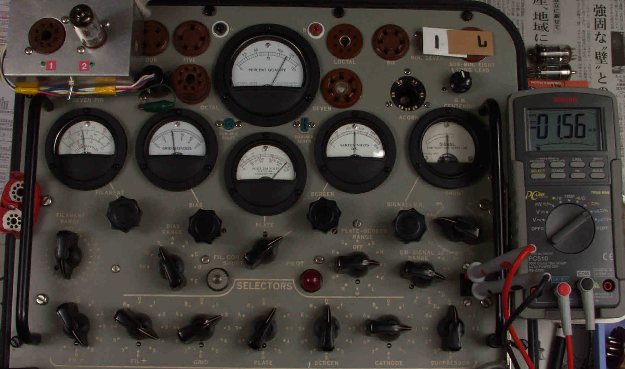 | V1. 新品購入「KT−88」1本目測定。 Gm=10700μmho、IP=116.2mA。 Bレンジ=15000μmhoレンジ、「Ep=250V、Esg2=250V、Eg1=−15V」。 |