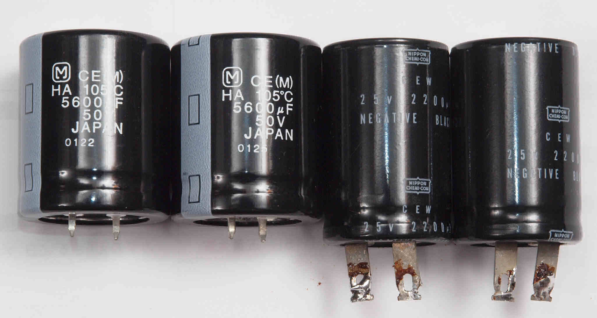 | AC3. 点検中 電源ブロック電解コンデンサー比較、下記から選択可能。 左=「TMC」100μ×2/500WV、右=「JJ」100μ×2/500WV。 |