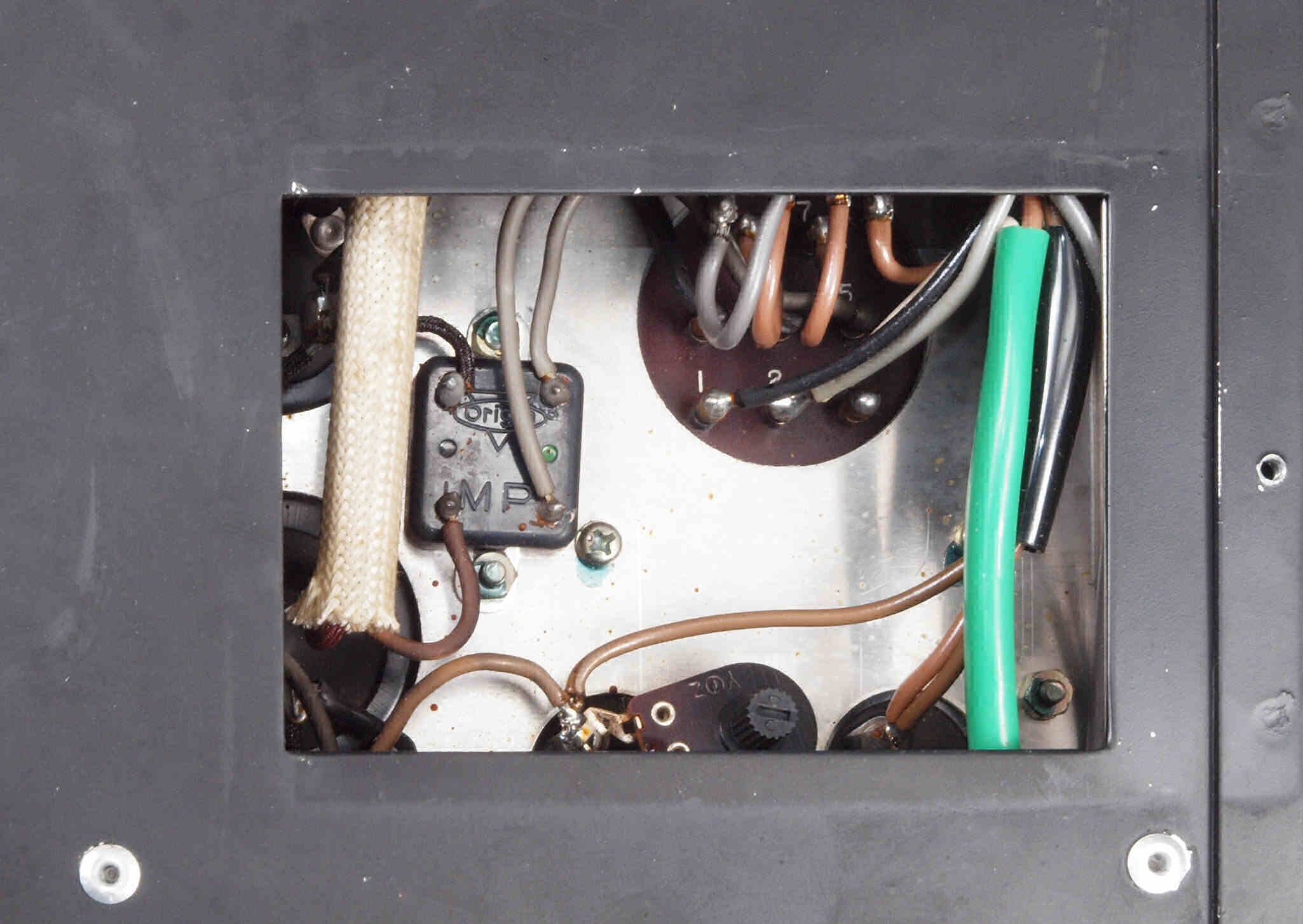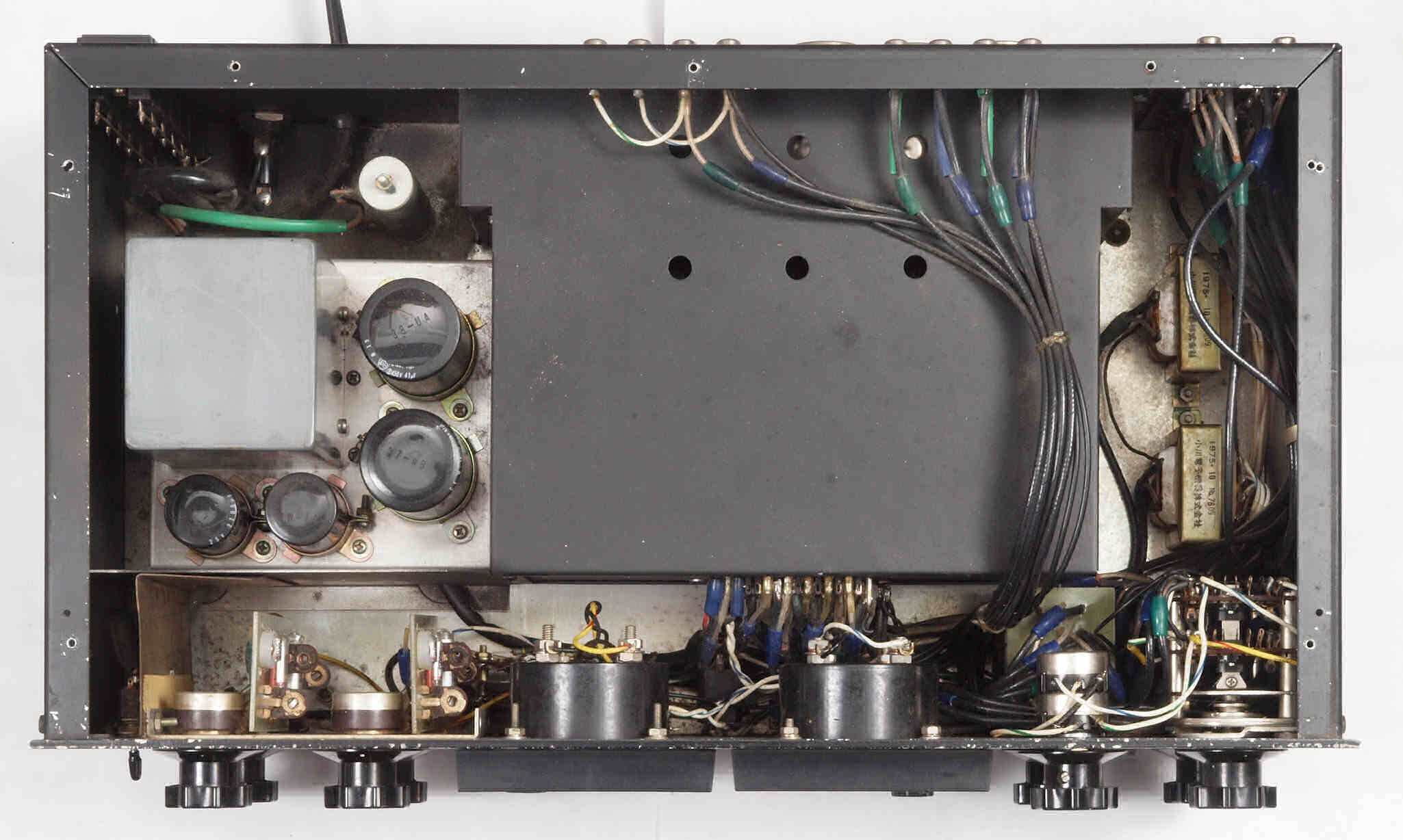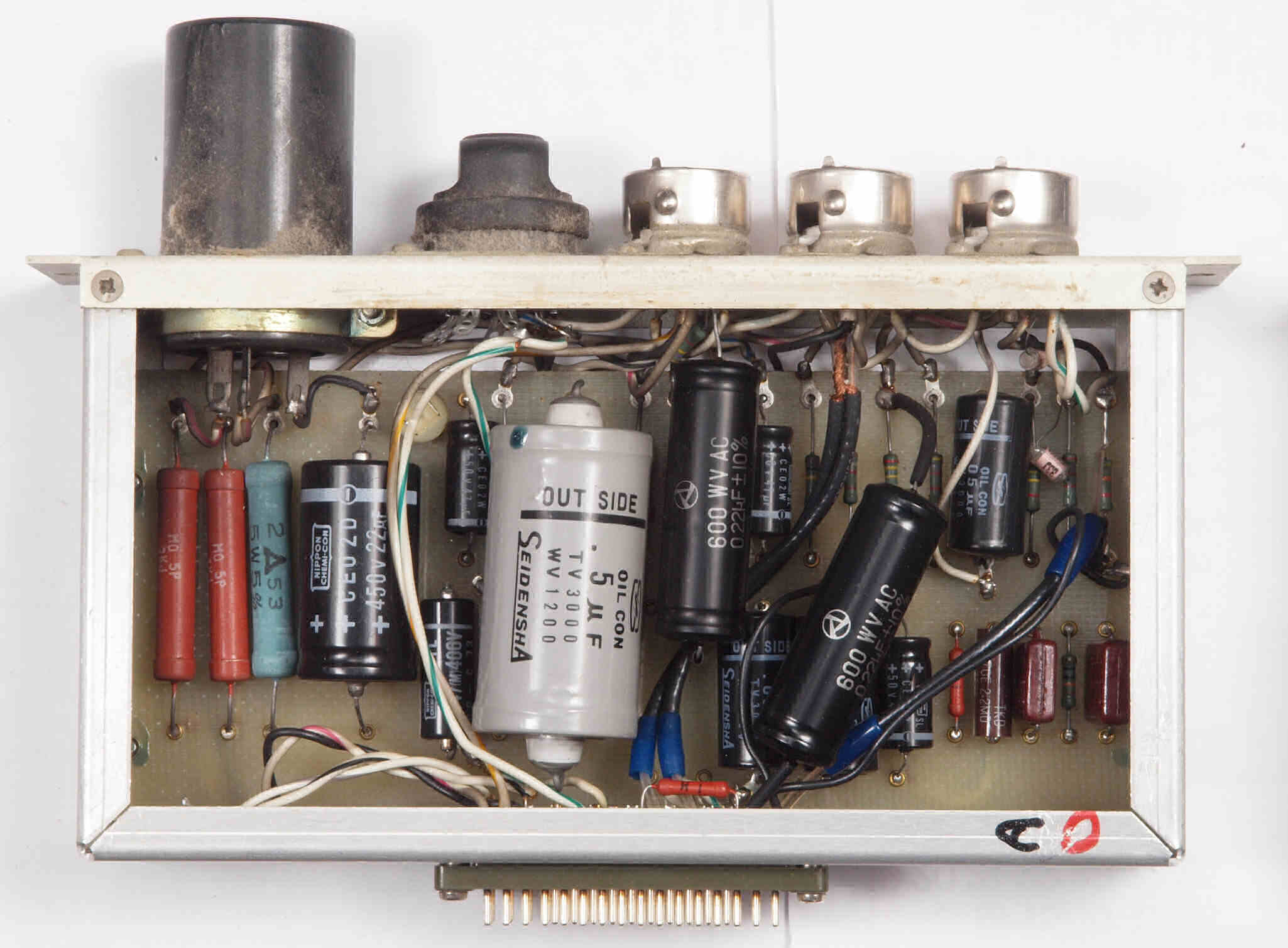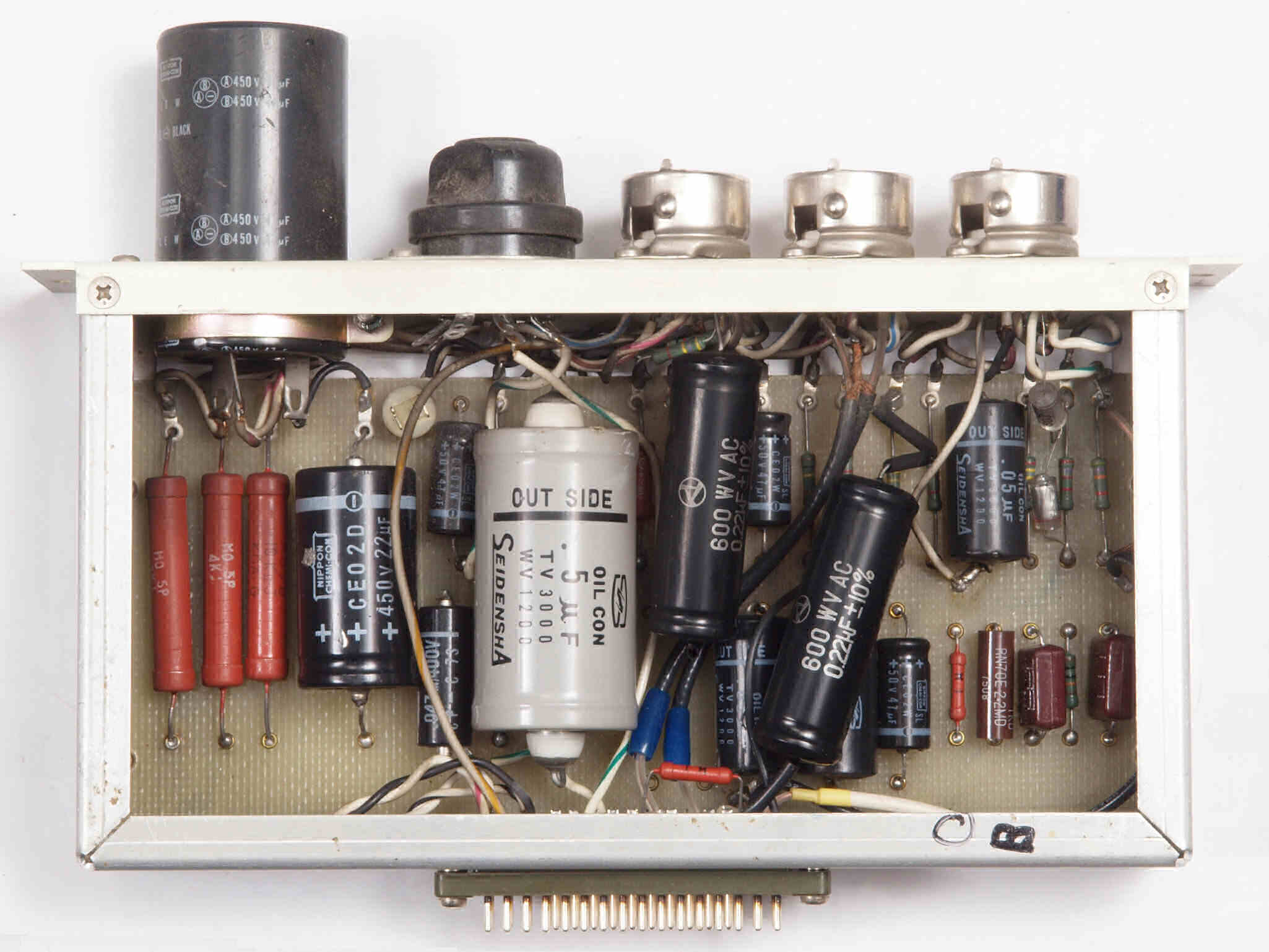 | C2A. 修理(交換)後 真空管ソケット、ブロック電解コンデンサー、シャシー裏側。 写真紛失の為L側写真。 | ||||||||||||||||||||||||||||||