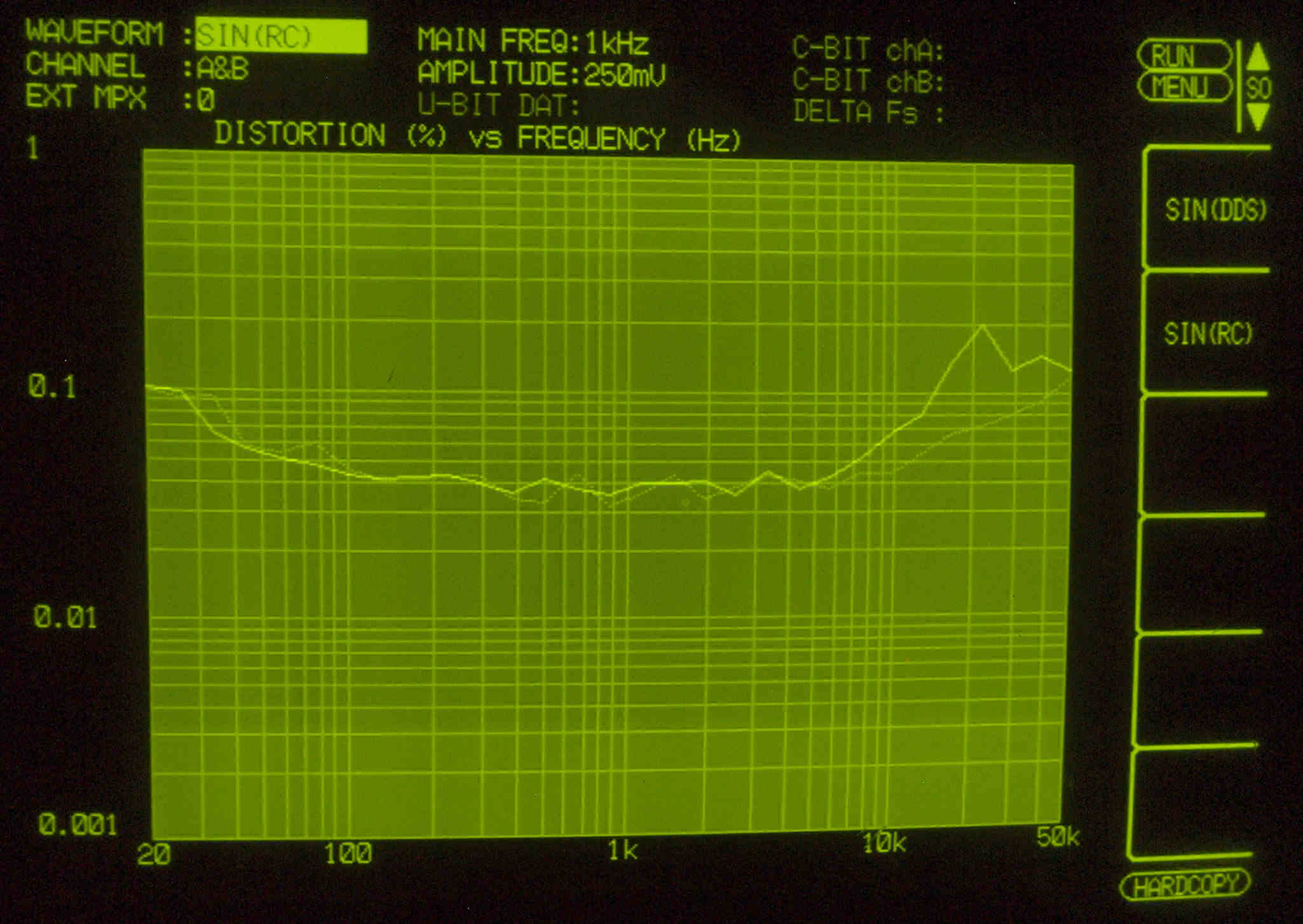 | E31. MM 50Hz入力、R側出力電圧=2V、 0.175%歪み。 L側出力電圧=2V、 0.162%歪み。 「FFT分析」のオシロのカーソル周波数、左=250Hz、右=1kHz。 |