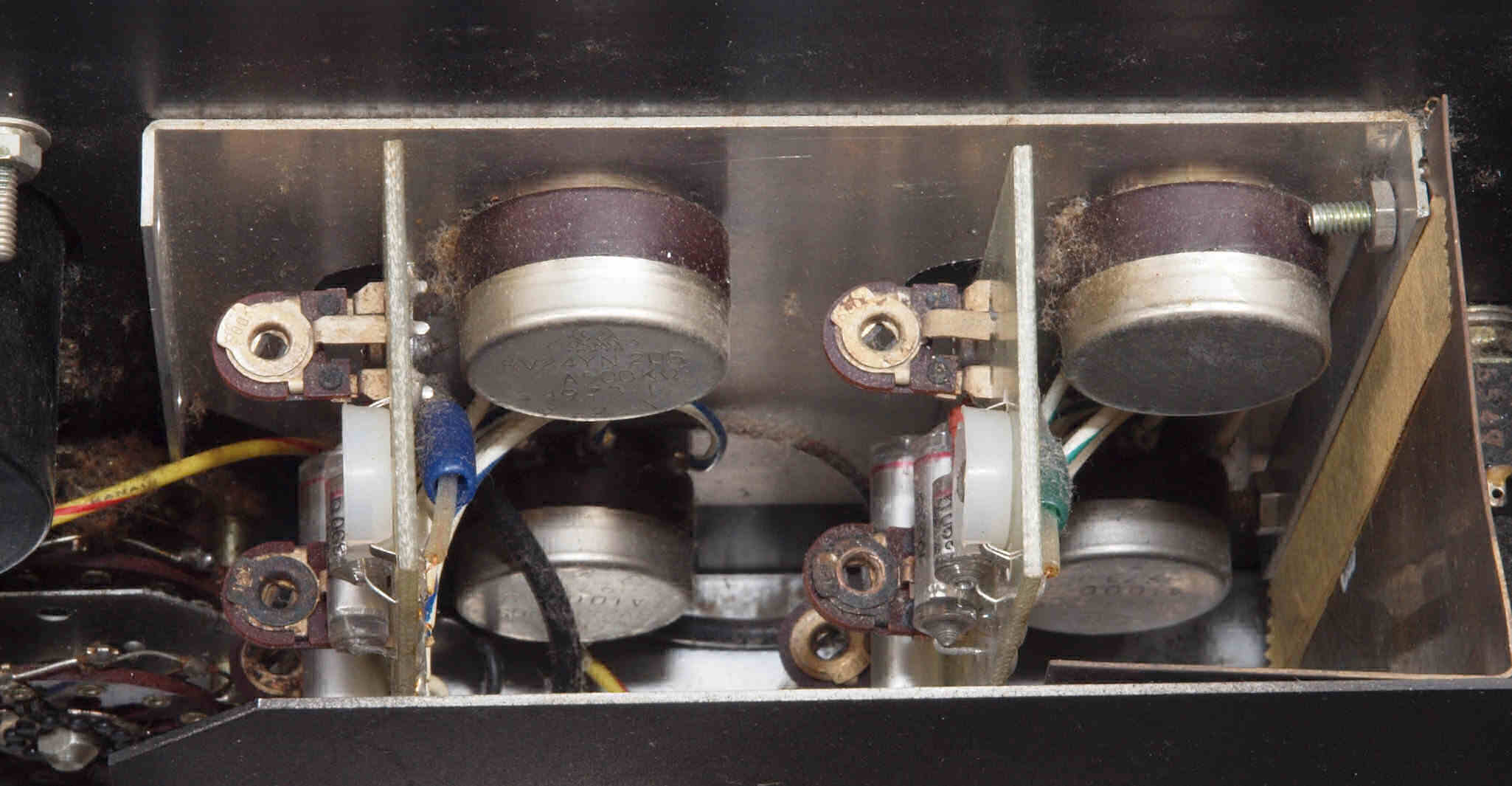 | AC2. 点検中 電源ブロック電解コンデンサー比較。 付いている左=47μ×2/450WV、 右=交換する「TMC」100μ×2/500WV。 |