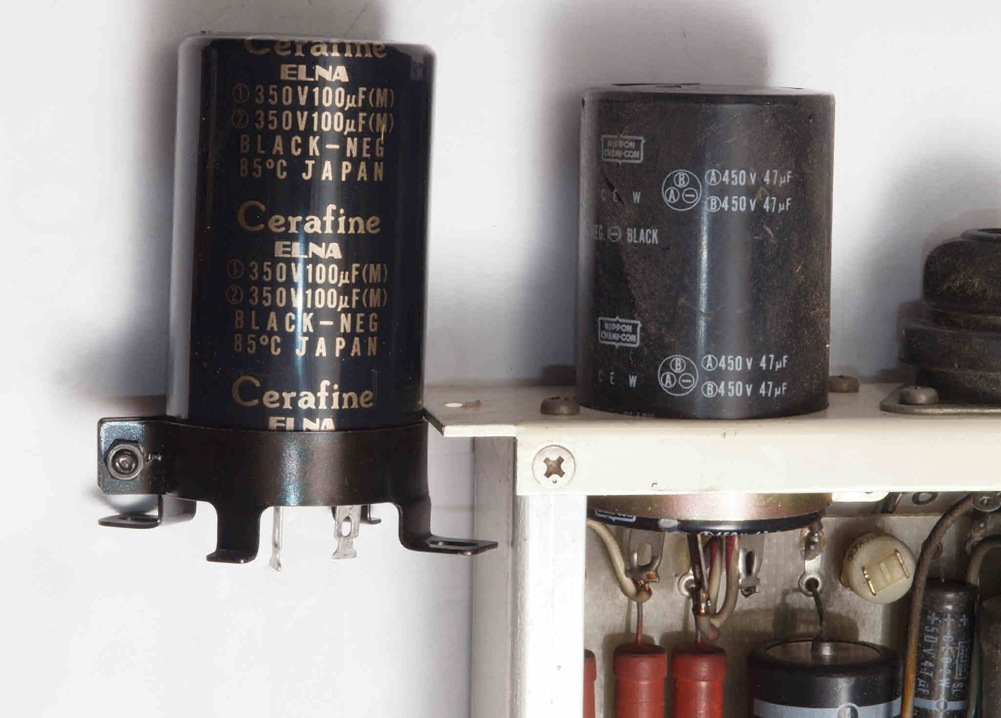| AC1. 点検中 電源ブロック電解コンデンサー比較。 左の「ELNA Cerafin=100μ+100μ/350WV」に交換。付いている右=47μ+47μ/450WV。 |