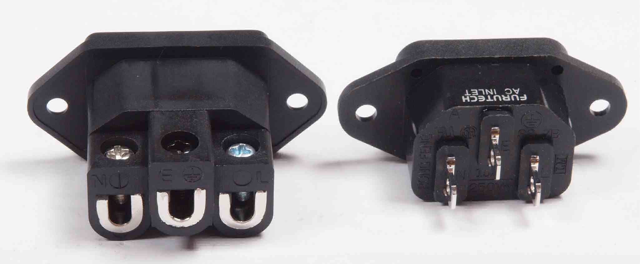 | A93. 点検中 左=支給品のネジ止め型3Pインレット、右=当方が使用する半田型3Pインレット。 ネジ止めは後で増す締め出来る場合に限る。 |