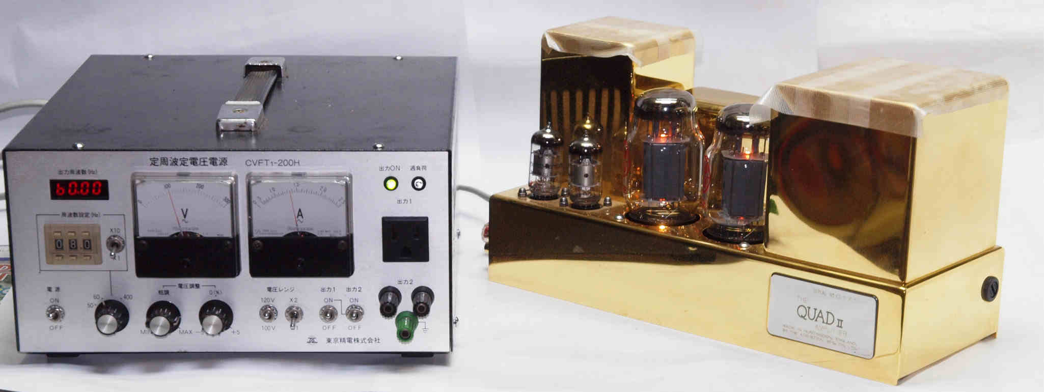 T1. 電源トランス点検。 左の電源装置で電圧、電流で測定する。 入力AC100V/0.0A。