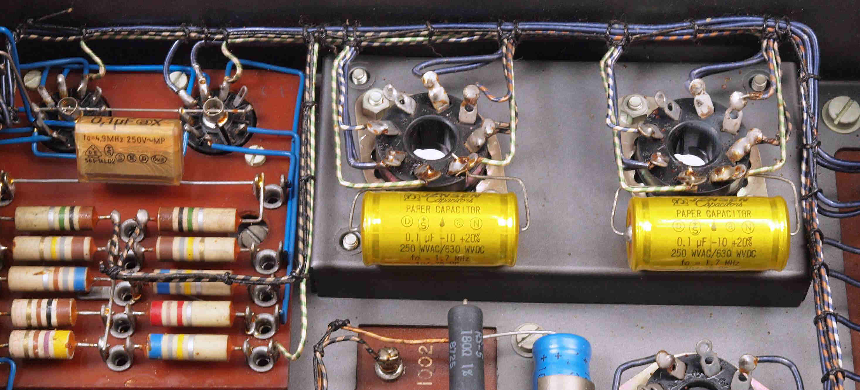 | U. TubeTester HickokTV−2B/Uによる付属真空管測定 。 真空管ハンドブック(規格表)の、 6267(EF86)相互コンダクタンス=2000μmho「Ep=250V、Ip=3mA、Esg=140V、Eg1=−2V」。 KT66相互コンダクタンス=6300μmho「Ep=250V、Esg=250V、Ip=85mA、Eg1=−15V」。 1960/1962/1964/1966ナショナル真空管ハンドブック、1995オーディオ用真空管マニアル、60/62/69東芝電子管ハンドブック、1962日立電子管ハンドブック、1965/1971全日本真空管マニュアル、RC15/19/26/27/28/29/30 Receiving Tube Manual、1966/実用真空管ハンドブック、1995世界の真空管カタログより。 5GK4(5AR45)エミション測定=VacuumTubeTester Hickok TV-2B/U の「5U4」検査方法による、破棄値=75。 |