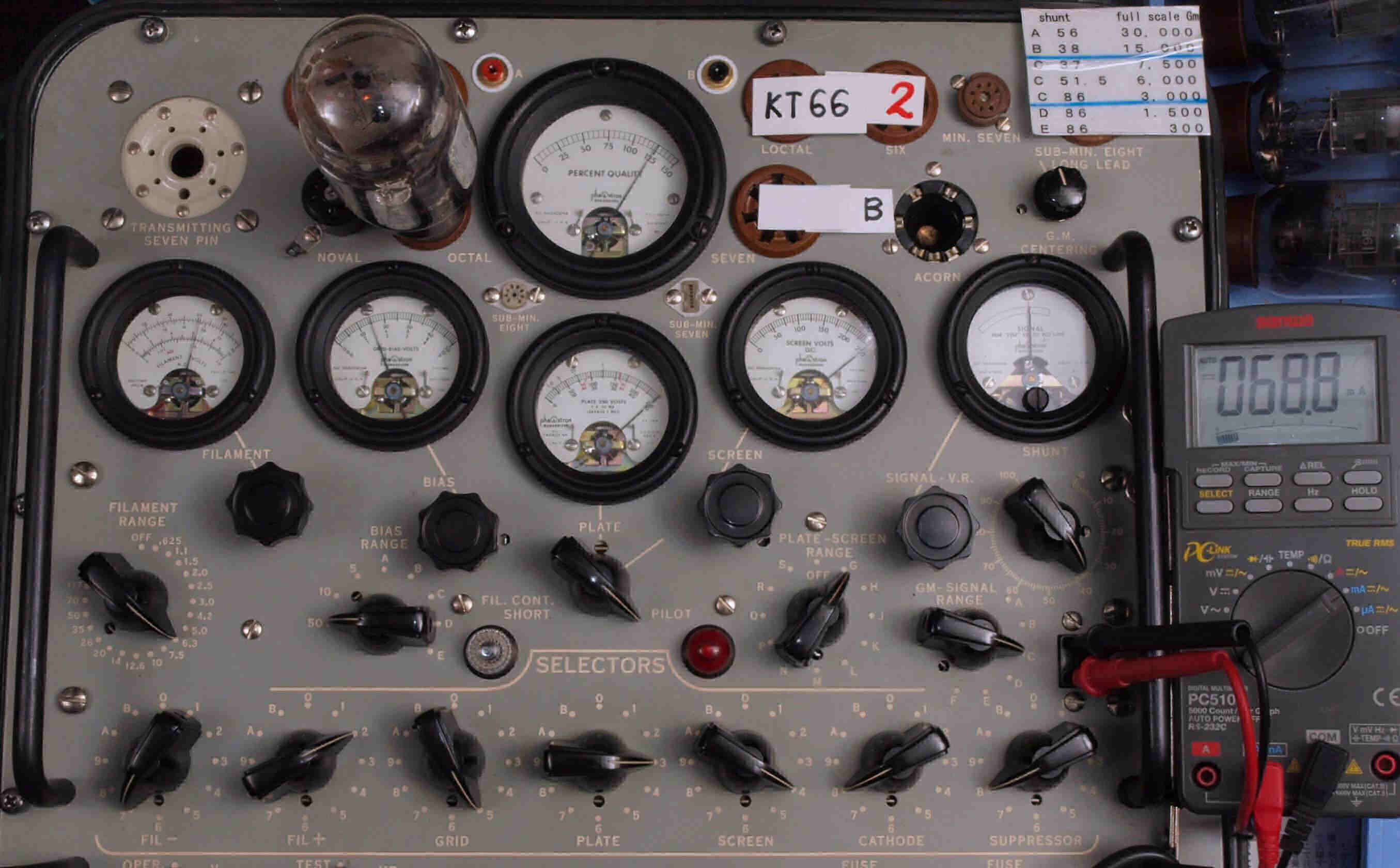 | U22. 付属2本目「KT66」。 Gm測定=6250μmho、IP=68.8mA。 Cレンジ=7500μmhoレンジでの測定、「Ep=250V、Esg=250V、Eg1=−15V」 |