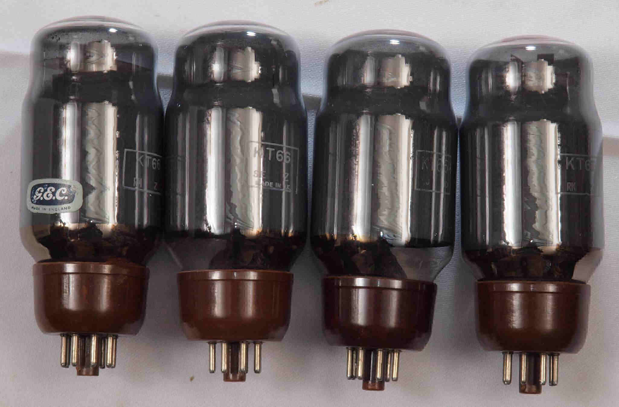 | *予備真空管「KT66」。 左から、1本目、2本目、、、、4本目。 画像をクリックすると、大きく(横幅2050ドット)表示されます。 |