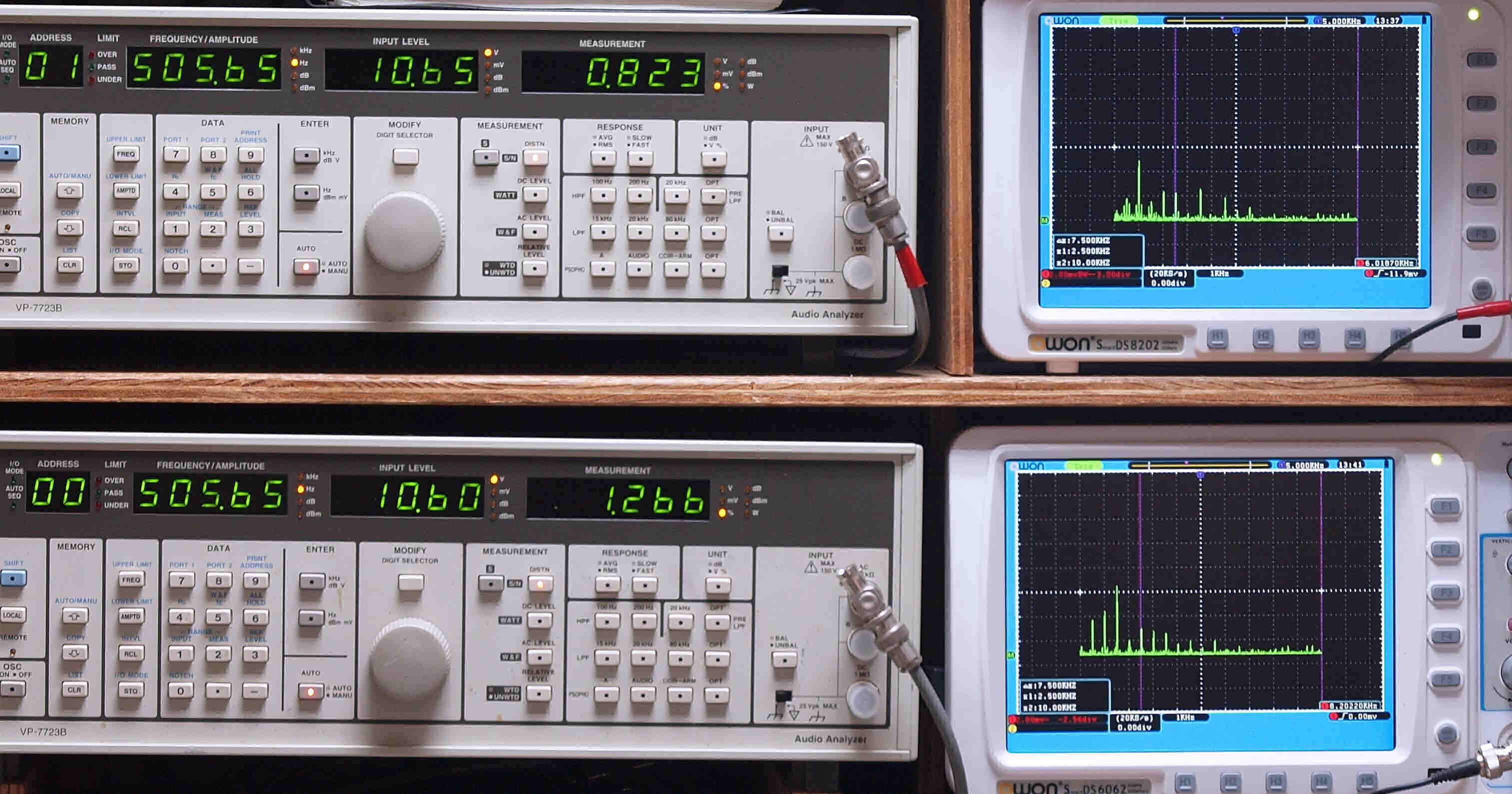 よって、ダイアル設定出力レベルより低くなります。測定機器の仕様や整備の様子はこちら、「VP−7723B」「VP−7201A」。 FFT画面の見方はこちら。