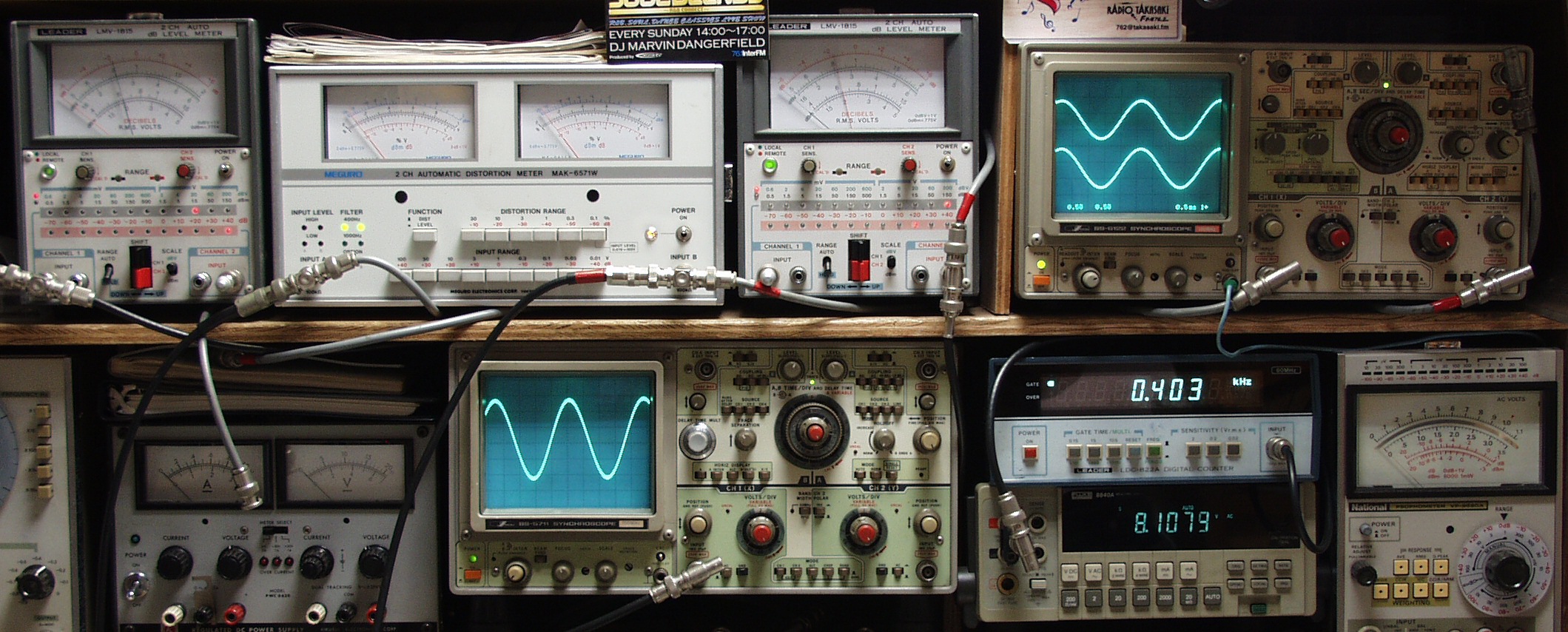 | AA. 修理前・測定 E1. 出力・歪み率測定・調整 <見方> 下段左端 オーディオ発振器より400HZ・1KHZの信号を出し(歪み率=約0.003%)これをAMPに入力し、出力を測定 下段中左 オシロ=入力波形(オーディオ発振器のTTLレベル) 下段中右上=周波数計 上段左端 電圧計=L側出力電圧測定、黒針のみ使用 上段中左 歪み率計=出力の歪み率測定 左メータ=L出力、右メータ=R出力 上段中右 電圧計=R側出力電圧測定、赤針のみ使用 上段右端 オシロ=出力波形 上=R出力、下=L出力(実際にはRL電圧計の出力「Max1V」を観測) 下段中右上 デジタル電圧計=出力電圧測定RLは切り替えて測定 |