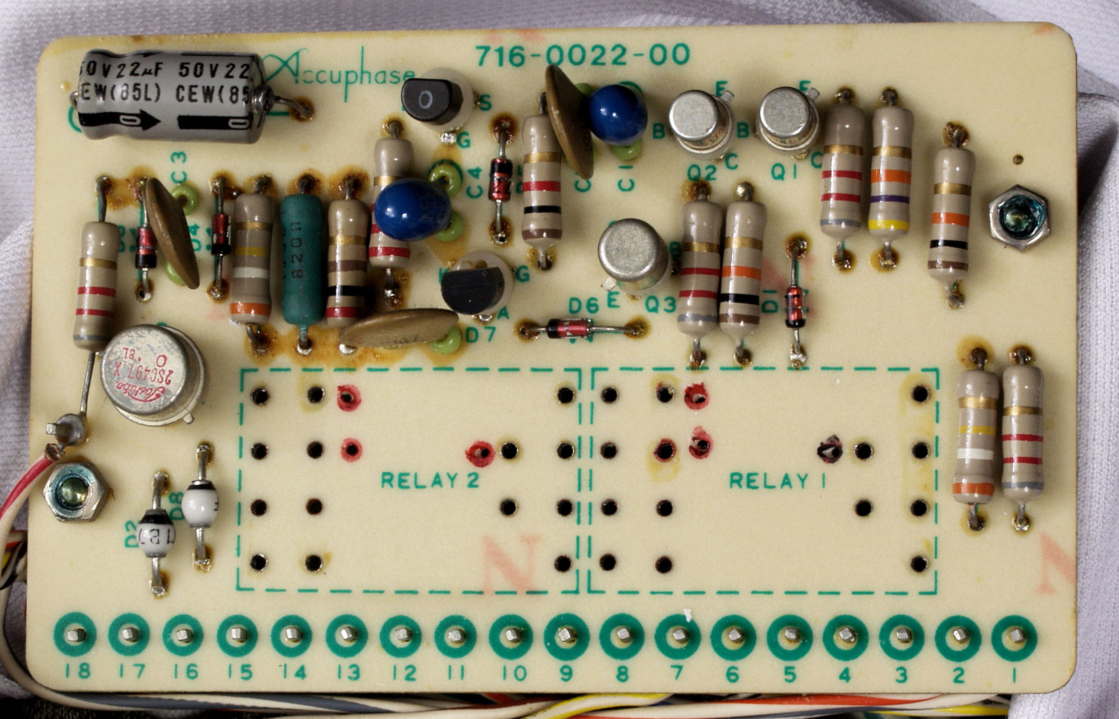 | C22. 修理後 R側−AMP基板 電解コンデンサー4個、半固定VR2個、フイルムコンデンサー2個、リレー2個交換 電解コンデンサー2個、フイルムコンデンサー2個追加 |