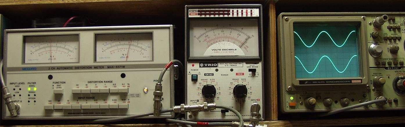 | T. 修理前点検測定 T1. 出力・歪み率測定・調整 FETは自己回復能力があるので、バラック修理後は1度もプロテクト動作なし AUX入力 400HZ SP出力電圧30V=112W 歪み率=1.8% |