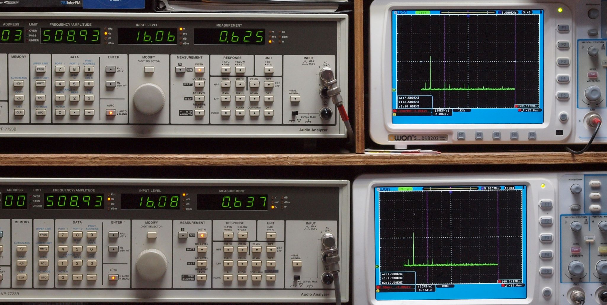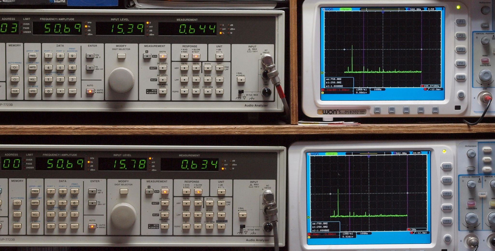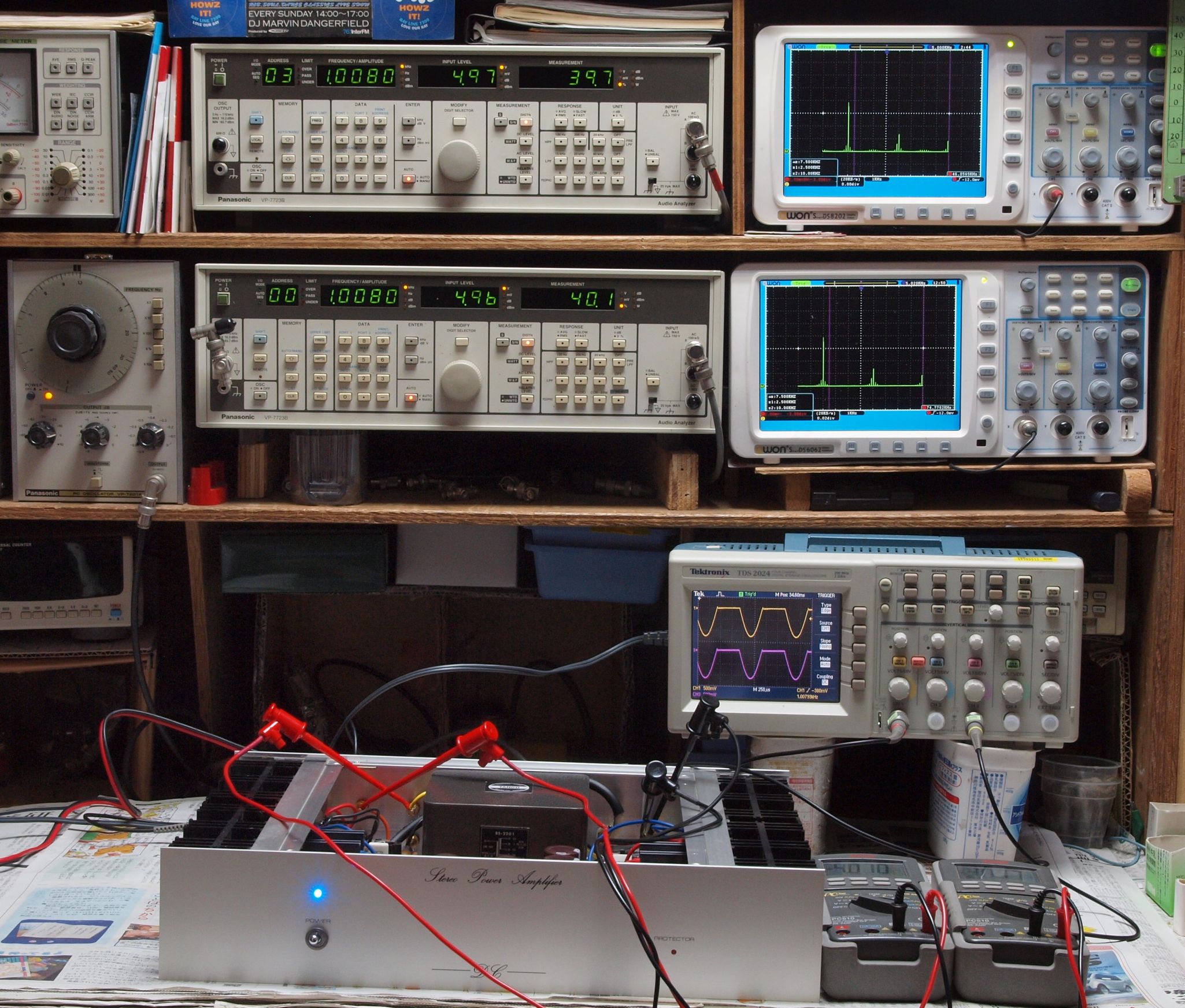 | E. 測定・調整 E1. 出力・歪み率測定・調整 「見方」。 上段中 右側SP出力を「Audio Analyzer Panasonic VP−7723B」により測定。 表示LED、 左端=メモリーNo、 中左=周波数測定、 中右=出力電圧測定、 右端=歪み率測定。 上段右端 VP−7723Bの基本波除去出力を「owon SDS8202(200MHZ)」で「FFT分析」表示。 下段中 左側SP出力を「Audio Analyzer Panasonic VP−7723B」により測定。 表示LED、 左端=メモリーNo、 中左=周波数測定、 中右=出力電圧測定、 右端=歪み率測定。 下段右端 VP−7723Bの基本波除去出力を「owon SDS6062(200MHZ)」で「FFT分析」表示。 下段左端 オーディオ発振器 VP−7201A より50Hz〜100kHzの信号を出し(歪み率=約0.003%)、ATT+分配器を通し、AMPに入力。 よって、ダイアル設定出力レベルより低くなります。測定機器の仕様や整備の様子はこちら、「VP−7723B」「VP−7201A」。 FFT画面の見方はこちら。 |