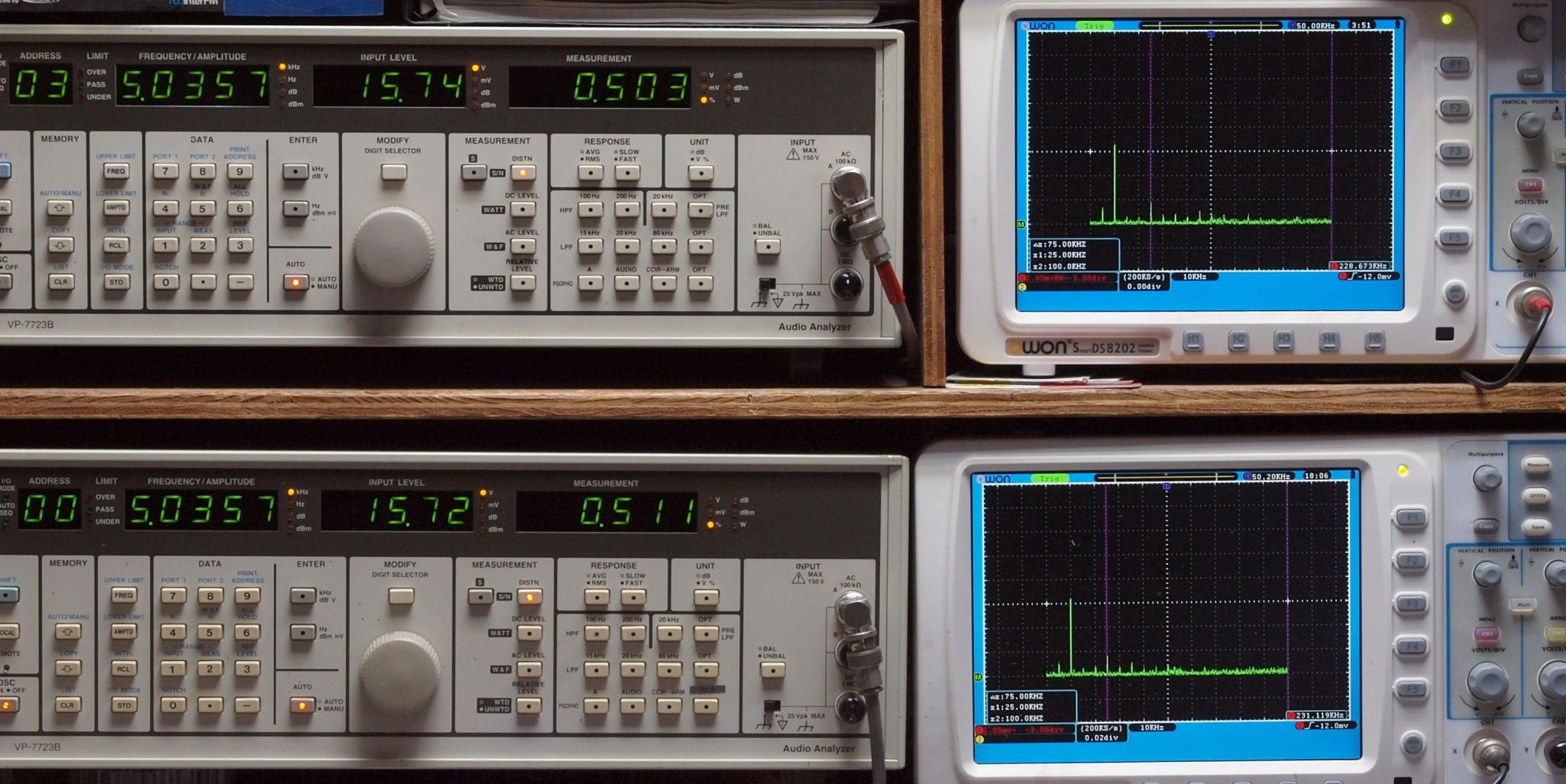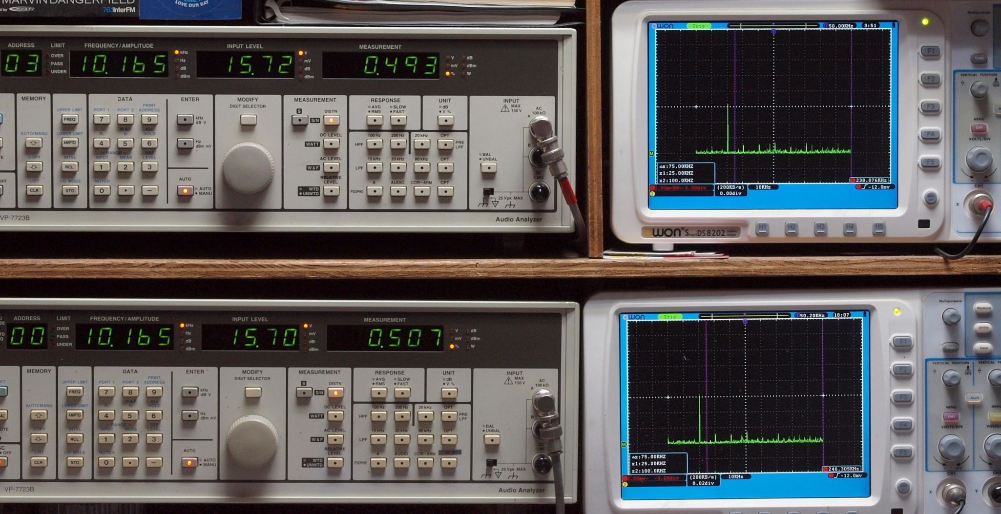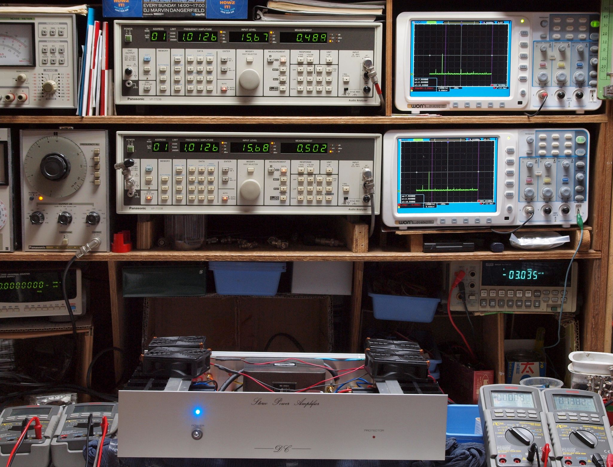| E. 測定・調整 E1. 出力・歪み率測定・調整 「見方」。 上段中 右側SP出力を「Audio Analyzer Panasonic VP−7723B」により測定。 表示LED、 左端=メモリーNo、 中左=周波数測定、 中右=出力電圧測定、 右端=歪み率測定。 上段右端 VP−7723Bの基本波除去出力を「owon SDS8202(200MHZ)」で「FFT分析」表示。 下段中 左側SP出力を「Audio Analyzer Panasonic VP−7723B」により測定。 表示LED、 左端=メモリーNo、 中左=周波数測定、 中右=出力電圧測定、 右端=歪み率測定。 下段右端 VP−7723Bの基本波除去出力を「owon SDS6062(200MHZ)」で「FFT分析」表示。 下段左端 オーディオ発振器 VP−7201A より50Hz〜100kHzの信号を出し(歪み率=約0.003%)、ATT+分配器を通し、AMPに入力。 よって、ダイアル設定出力レベルより低くなります。測定機器の仕様や整備の様子はこちら、「VP−7723B」「VP−7201A」。 FFT画面の見方はこちら。 |