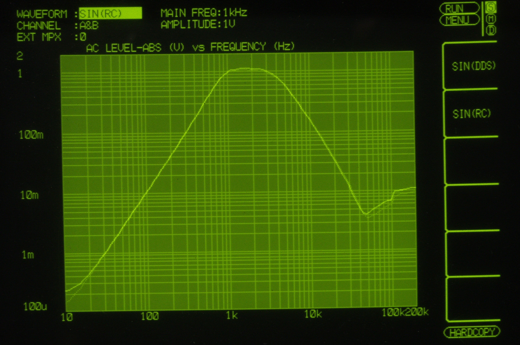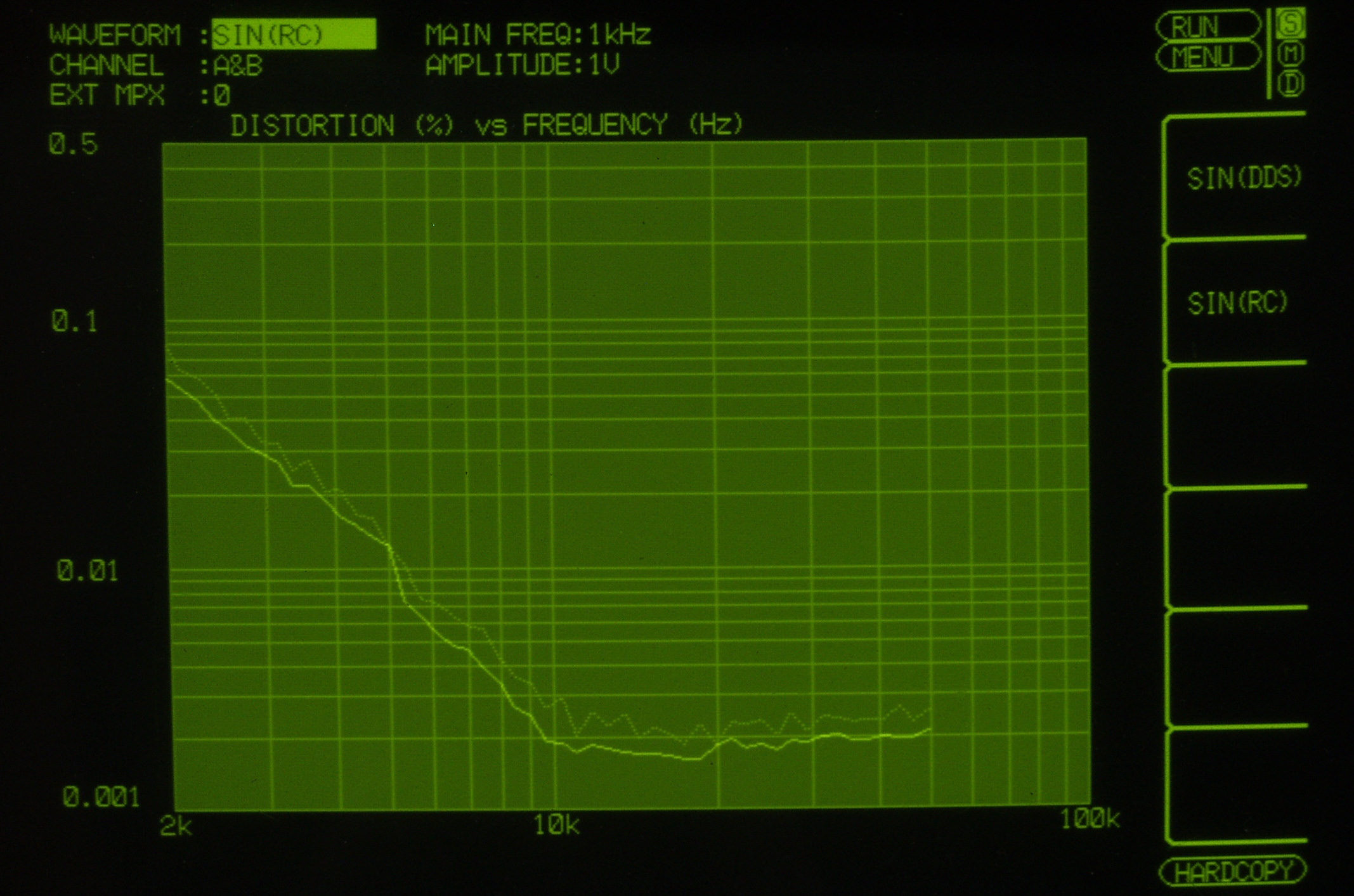 | EE33. 歪み測定チャネ3、入力電圧=1V一定入力、VRはmax、左出力=薄(細い)色 右出力=濃い(太い)色 200HZ以下及び、30KHZ以上は入力レベルが測定以下になる為、表示出来ない。 |