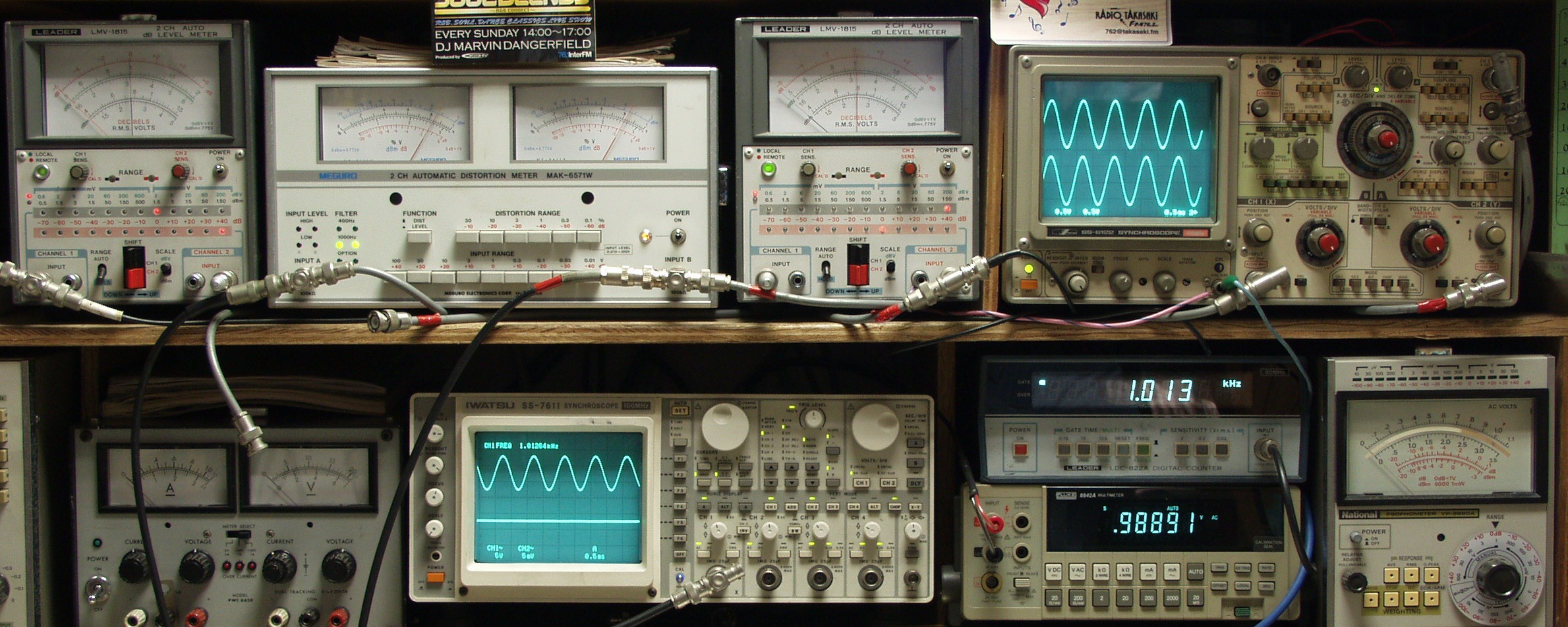 上段中左 歪み率計=SP出力の歪み率測定 左メータ=L出力、右メータ=R出力