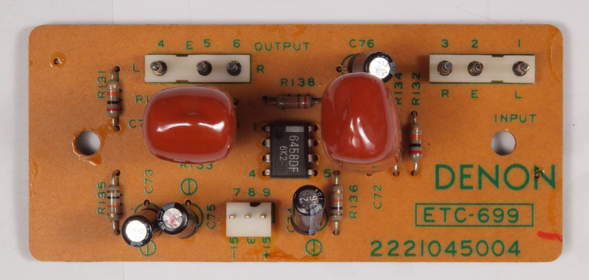 | C114. 修理中 EQ−HEAD-AMP基板。 フイルムコンデンサー(高域補正)の足の差し込みが不十分で、半田が無。 MCトランス使用のMC入力(Phono−1)なので、トランスの特性のお陰で、RLの差が僅差で解らなかったかも? |