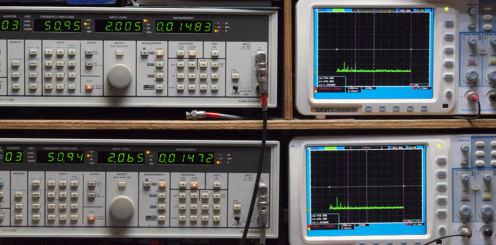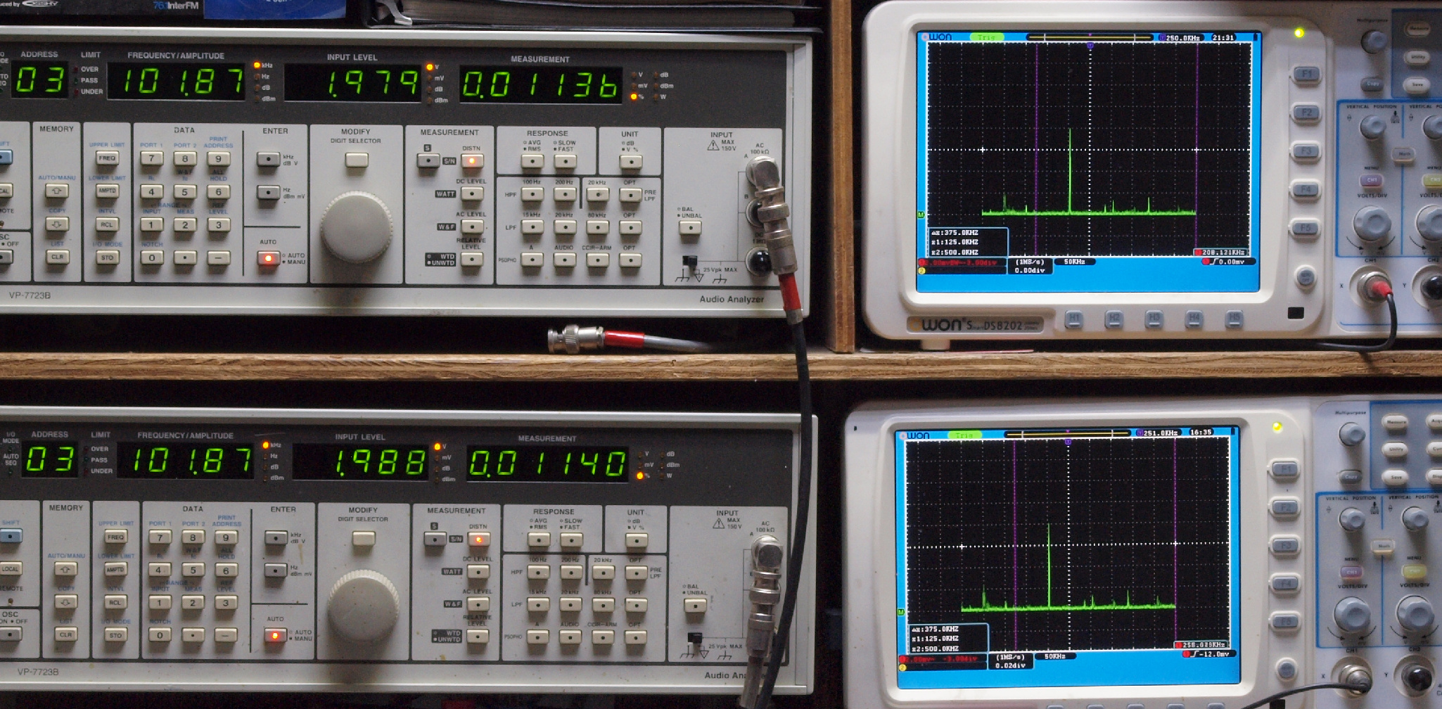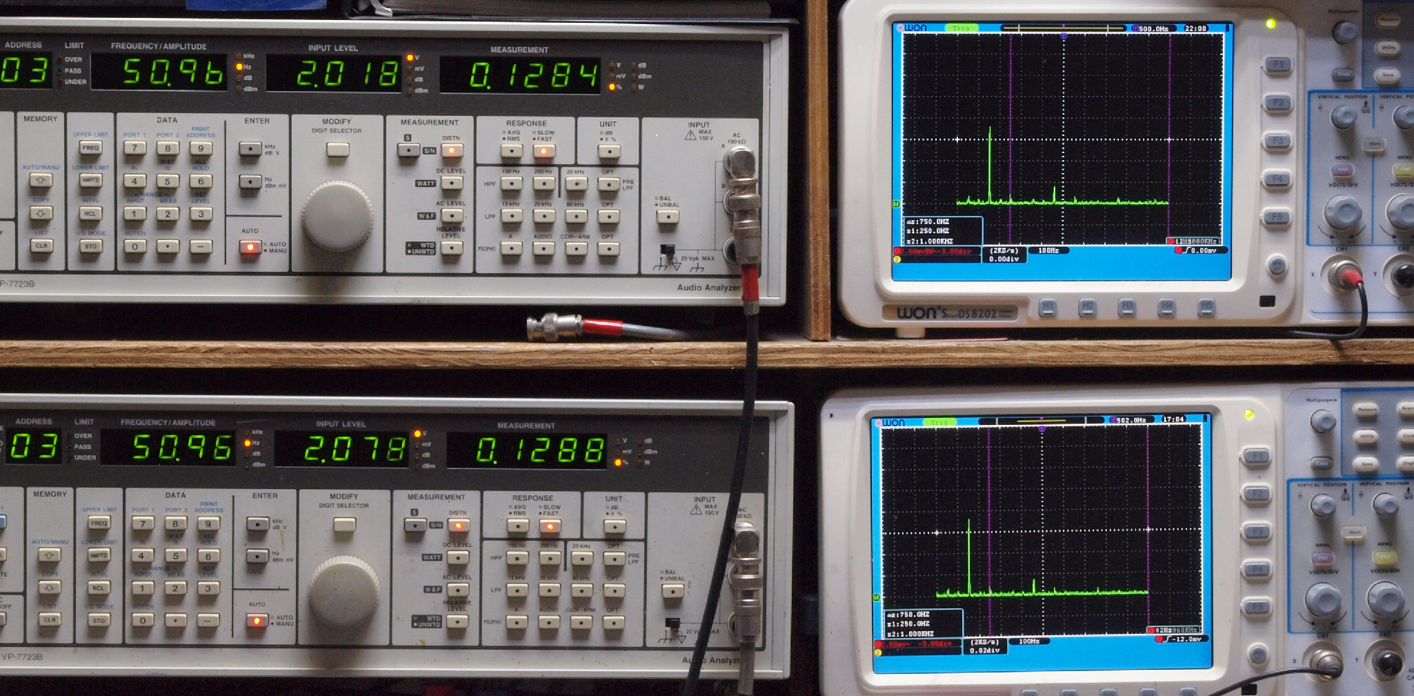 | E. 調整・測定。 画像をクリックすると、大きく(横幅2050ドット)表示されます。 E0. 出力・歪み率測定・調整。 「見方」。 上段中 右側SP出力を「Audio Analyzer Panasonic VP−7723B」により測定。 表示LED、 左端=メモリーNo、 中左=周波数測定、 中右=出力電圧測定、 右端=歪み率測定。 上段右端 VP−7723Bの基本波除去出力を「owon SDS8202(200MHZ)」で「FFT分析」表示。 下段中 左側SP出力を「Audio Analyzer Panasonic VP−7723B」により測定。 表示LED、 左端=メモリーNo、 中左=周波数測定、 中右=出力電圧測定、 右端=歪み率測定。 下段右端 VP−7723Bの基本波除去出力を「owon SDS6062(200MHZ)」で「FFT分析」表示。 下段左端 オーディオ発振器 VP−7201A より50Hz〜100kHzの信号を出し(歪み率=約0.003%)、ATT+分配器を通し、AMPに入力。 よって、ダイアル設定出力レベルより低くなります。測定機器の仕様や整備の様子はこちら、「VP−7723B」「VP−7201A」。 FFT画面の見方はこちら。 |