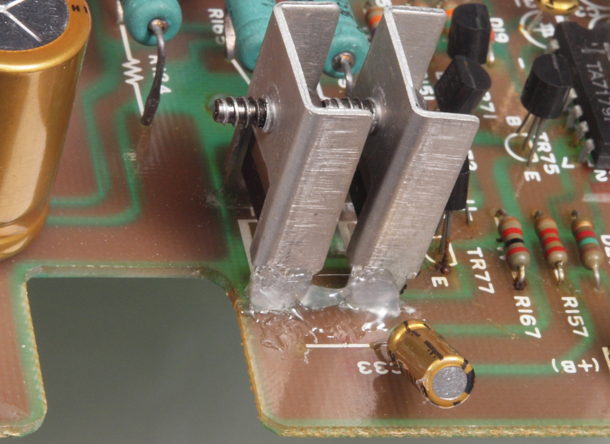 | C115. 修理後 MC−AMP基板。放熱器を固定(接着)する−2、接着剤&ホットボンドで固定。 | ||||||||||||||||||||||||||||||||||||||||||||||||||||||||||||||||||||||||