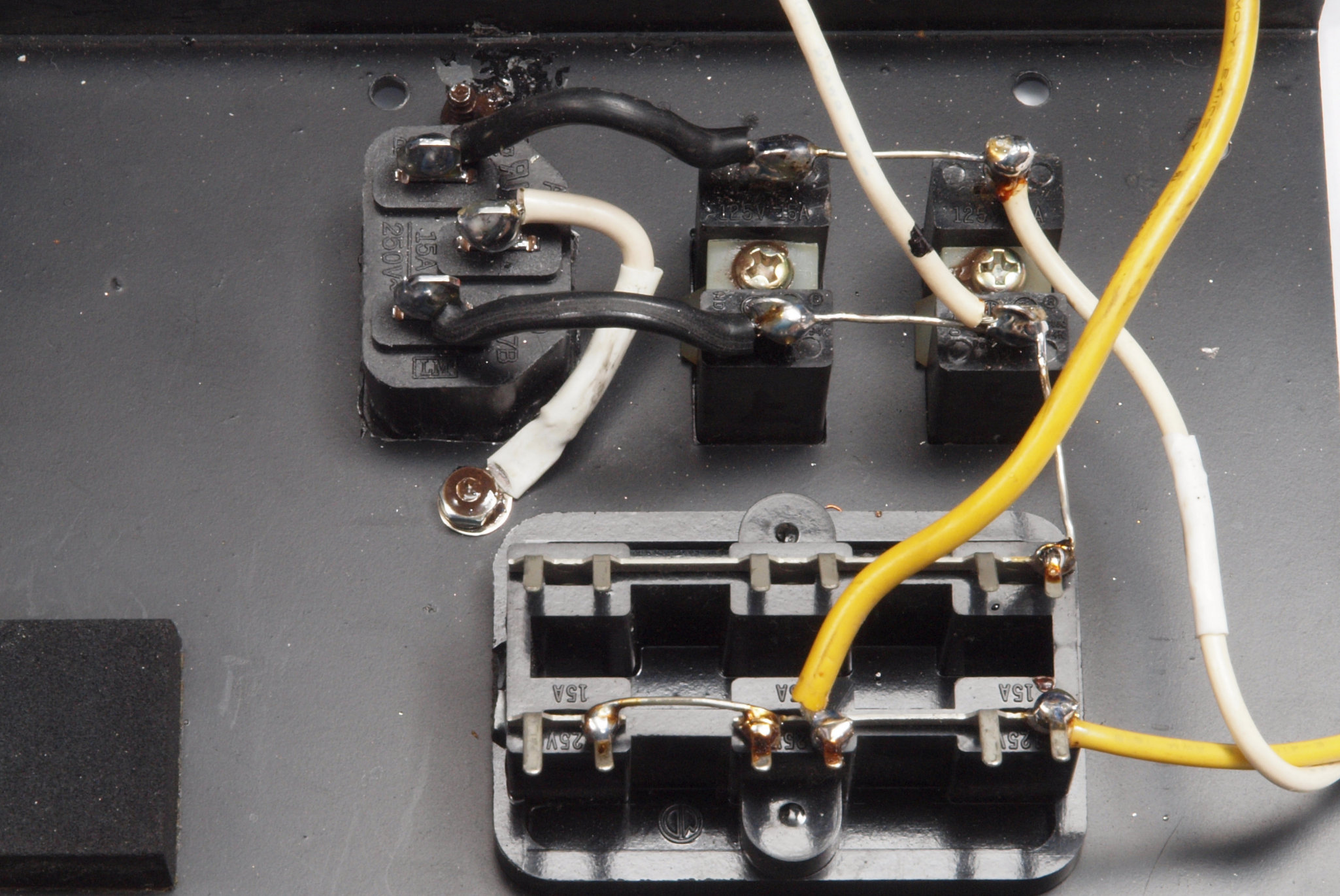 | CB5. 修理後 3Pインレット取り付け裏配線。 しっかりとアースを取る。 | ||||||||||||||||||||||||||||||||||||||||||||||||||||||||||||||||||||||||