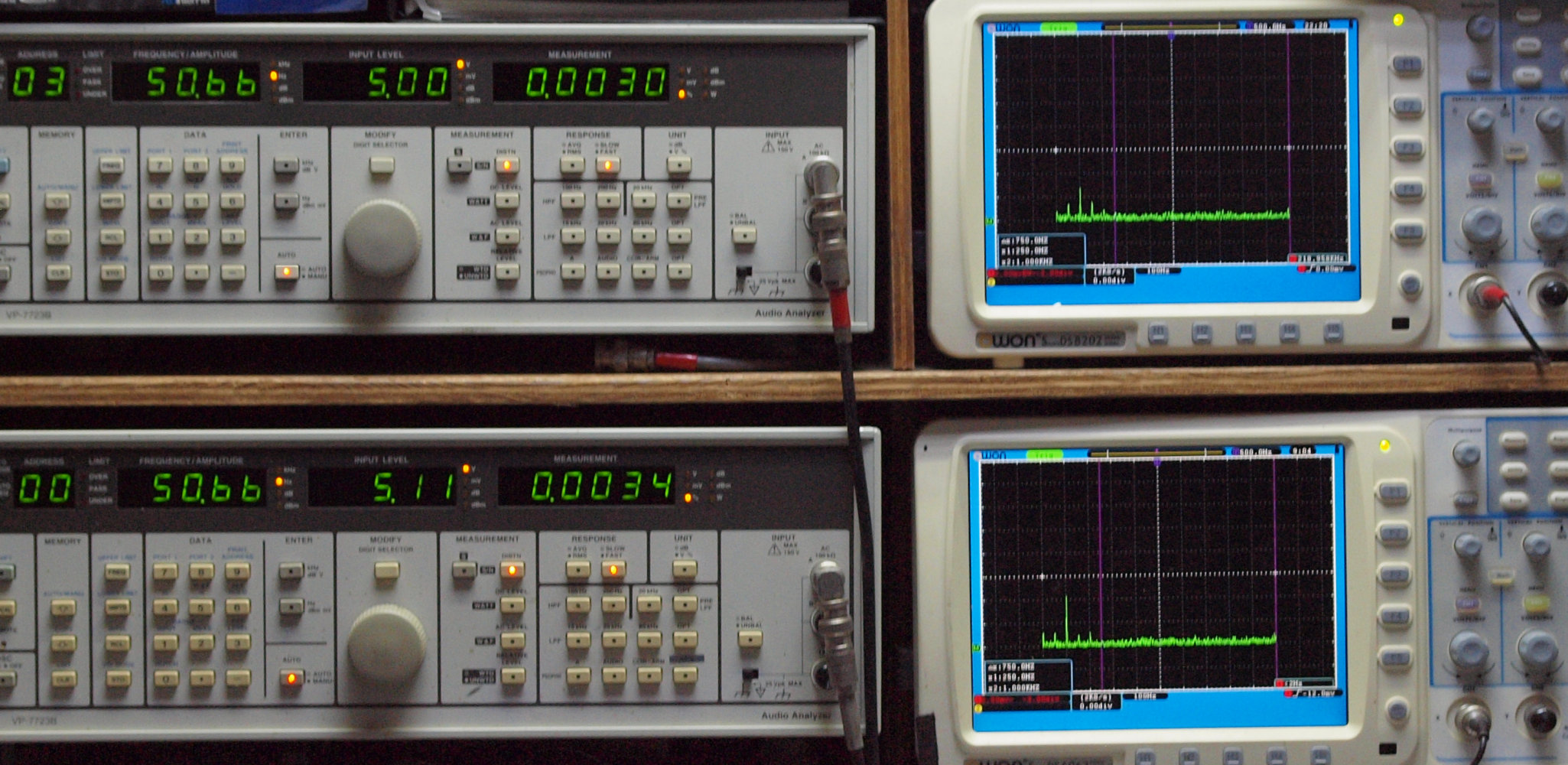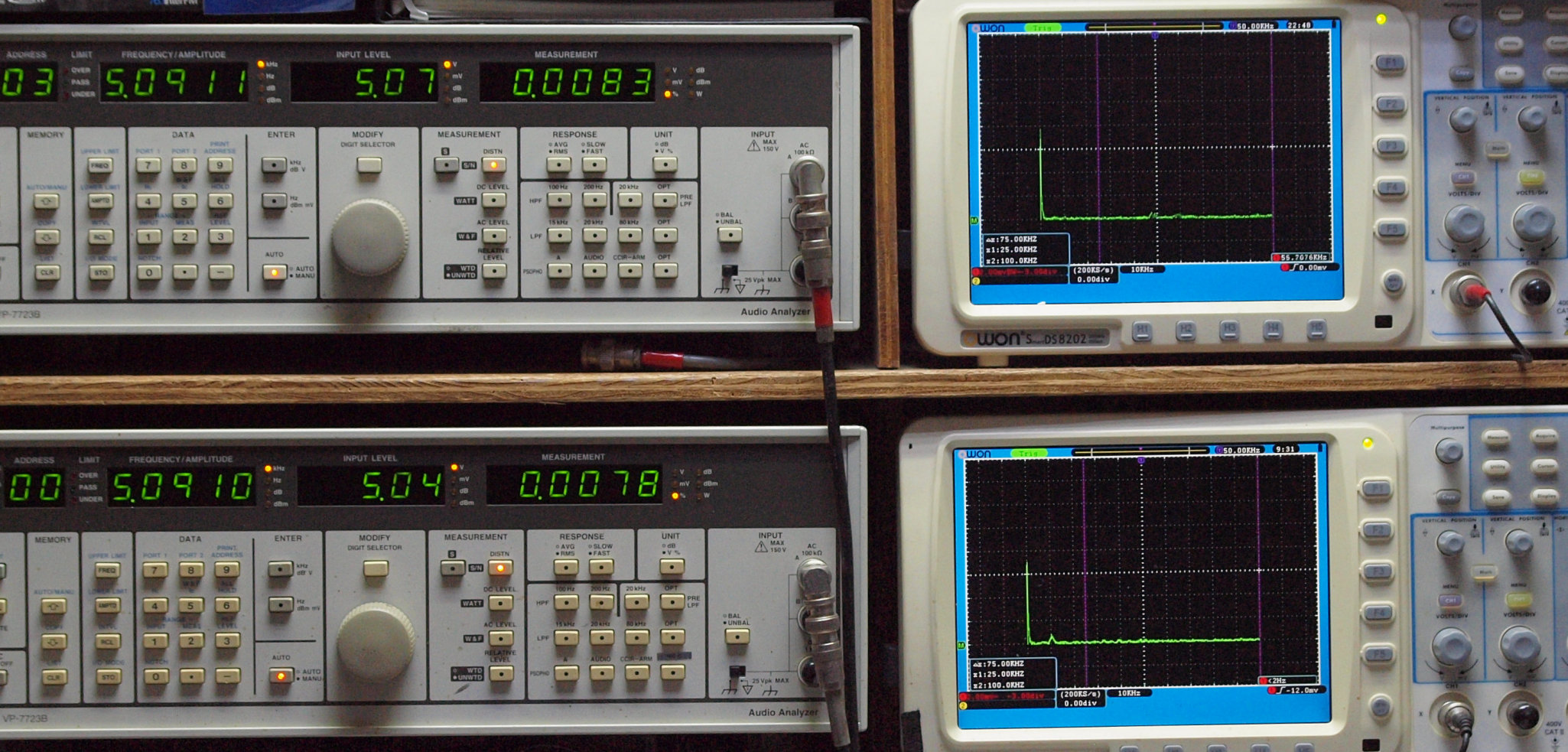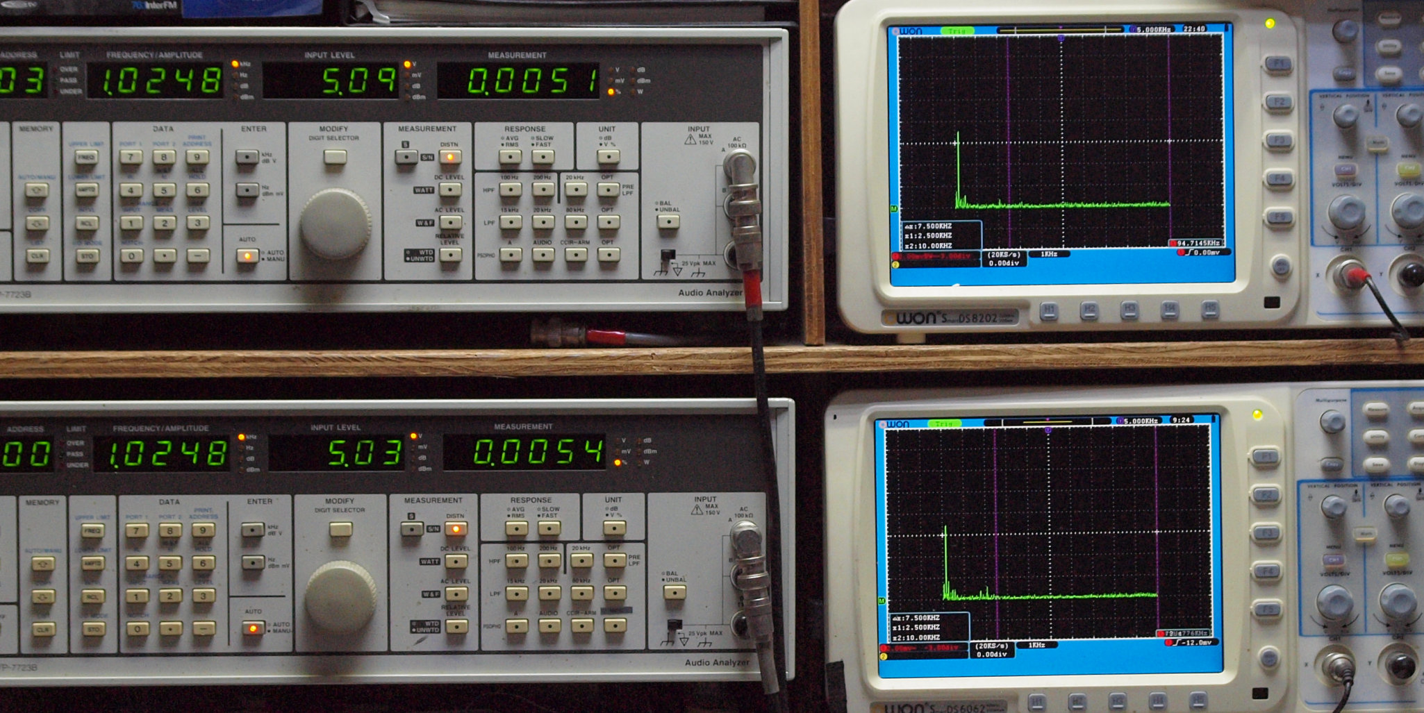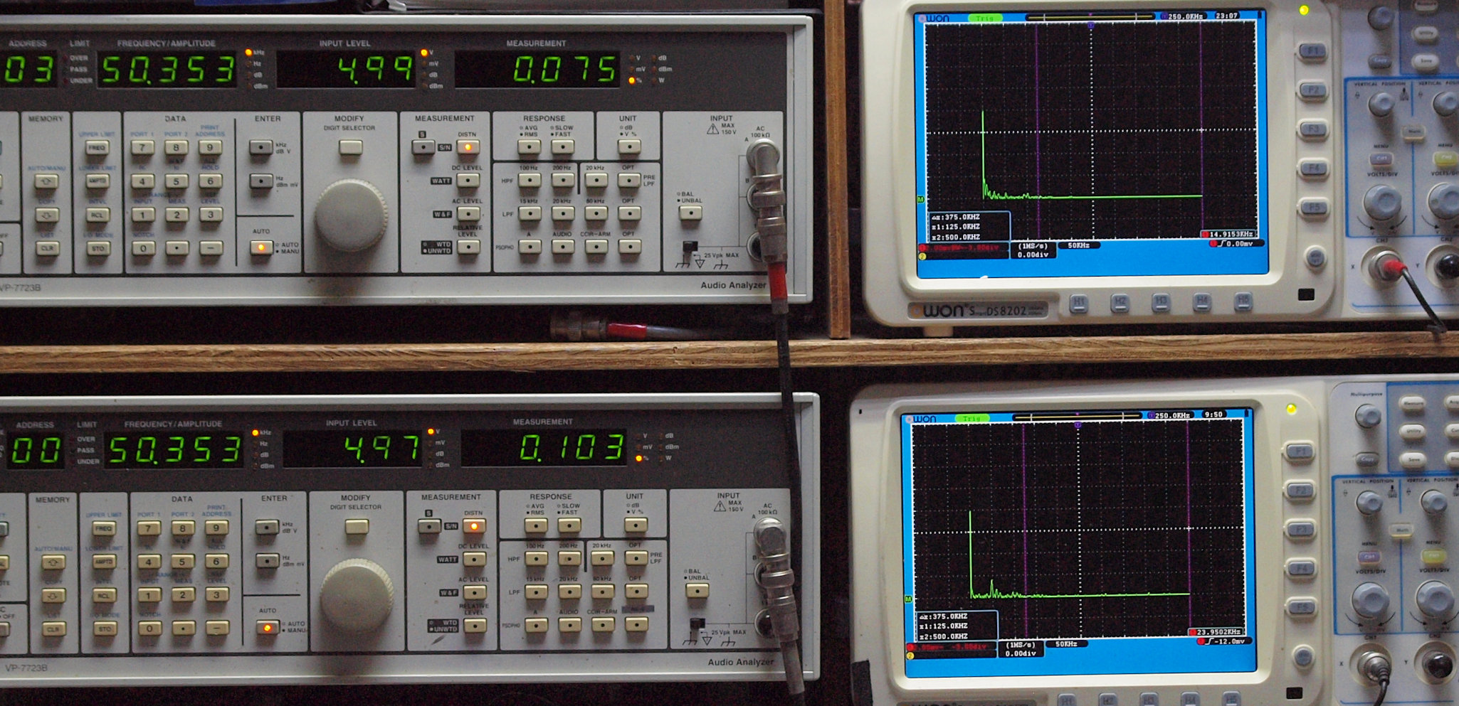 | E. 調整・測定。 画像をクリックすると、大きく(横幅2050ドット)表示されます。 E0. 出力・歪み率測定・調整。 「見方」。 上段中 右側出力を「Audio Analyzer Panasonic VP−7723B」により測定。 表示LED、 左端=メモリーNo、 中左=周波数測定、 中右=出力電圧測定、 右端=歪み率測定。 上段右端 VP−7723Bの基本波除去出力を「owon SDS8202(200MHZ)」で「FFT分析」表示。 下段中 左側出力を「Audio Analyzer Panasonic VP−7723B」により測定。 表示LED、 左端=メモリーNo、 中左=周波数測定、 中右=出力電圧測定、 右端=歪み率測定。 下段右端 VP−7723Bの基本波除去出力を「owon SDS6062(200MHZ)」で「FFT分析」表示。 下段左端 オーディオ発振器 VP−7201A より50Hz〜100kHzの信号を出し(歪み率=約0.003%)、ATT+分配器を通し、AMPに入力。 よって、ダイアル設定出力レベルより低くなります。測定機器の仕様や整備の様子はこちら、「VP−7723B」「VP−7201A」。 FFT画面の見方はこちら。 |