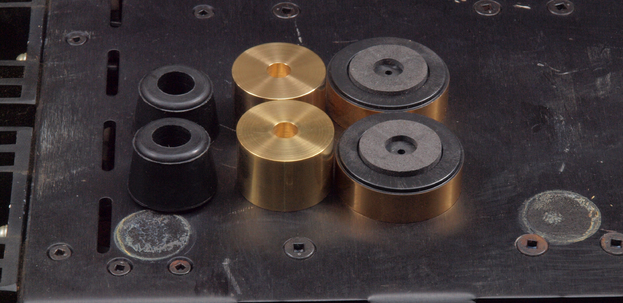 | A51. 点検中 R側終段TR(トランジスター)。 OEMの「MB6521、MB6522」、 モトローラーの汎用品の「2N6609」、ONSEMの「MJ15050」の混在。 |