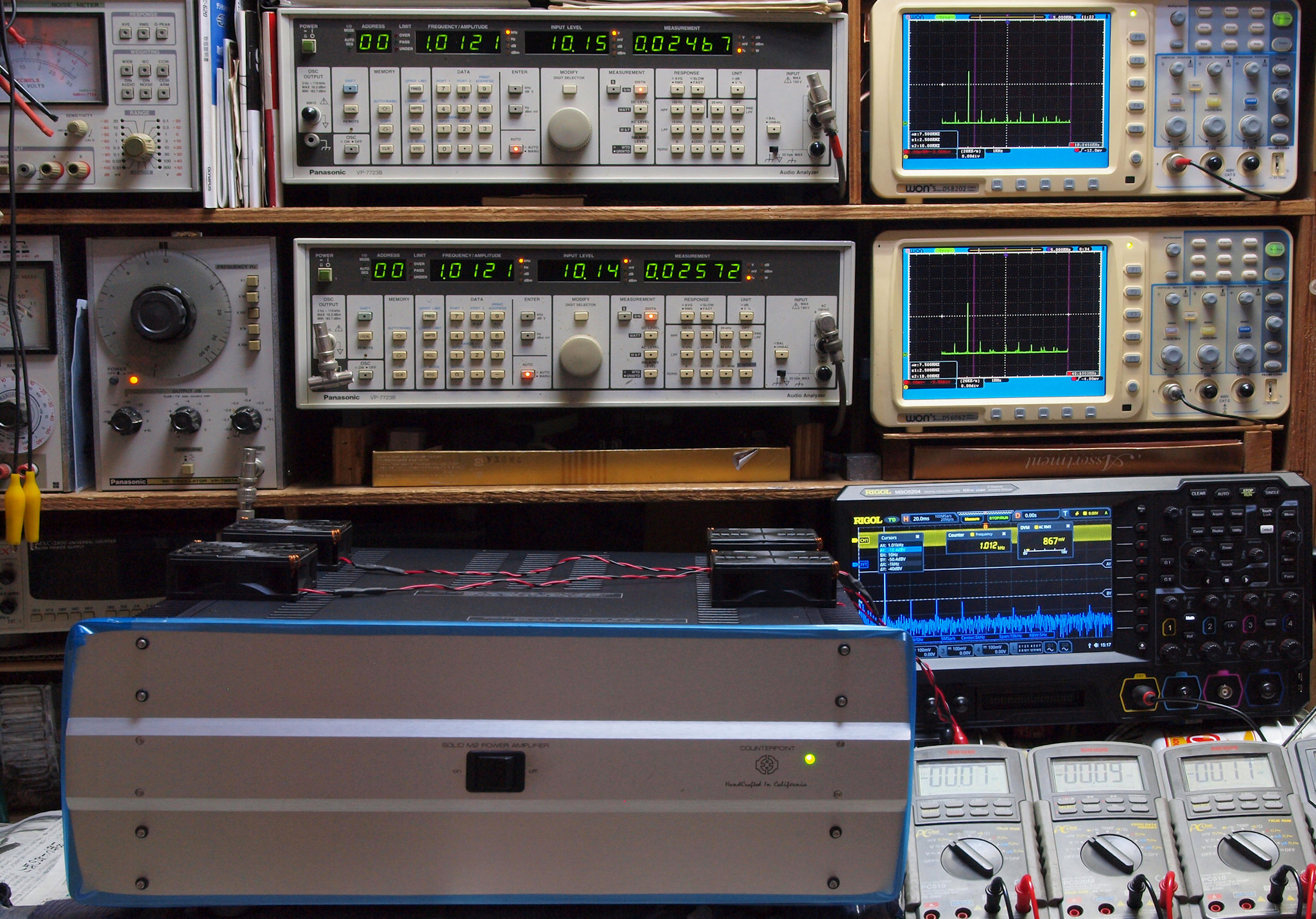 下段左端 オーディオ発振器 VP−7201A より50Hz〜100kHzの信号を出し(歪み率=約0.003%)、ATT+分配器を通し、AMPに入力。