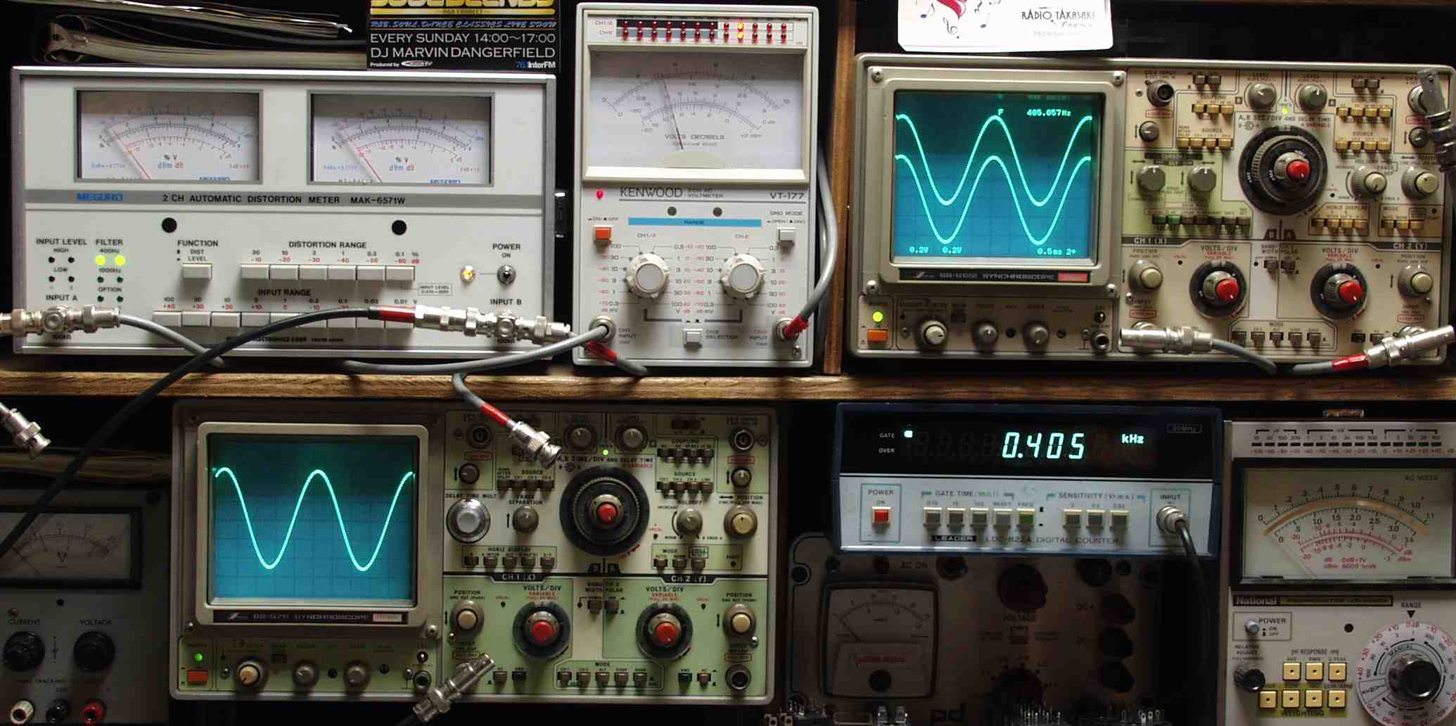 | E. 調整・測定。 画像をクリックすると、大きく(横幅2050ドット)表示されます。 E1A. 出力/歪み測定・調整 <見方> 下左オーデオ発振器より400HZ・1KHZの信号を出す(歪み率=約0.003%) 下中=入力波形(オーデオ発振器のTTLレベル) 下右=周波数計 上左=SP出力の歪み率測定 左メータ=L出力、右メータ=R出力 上中=SP出力電圧測定器、赤針=R出力、黒針=L出力 上右=SP出力波形オシロ 上=R出力、下=L出力(出力電圧測定器の出力) |