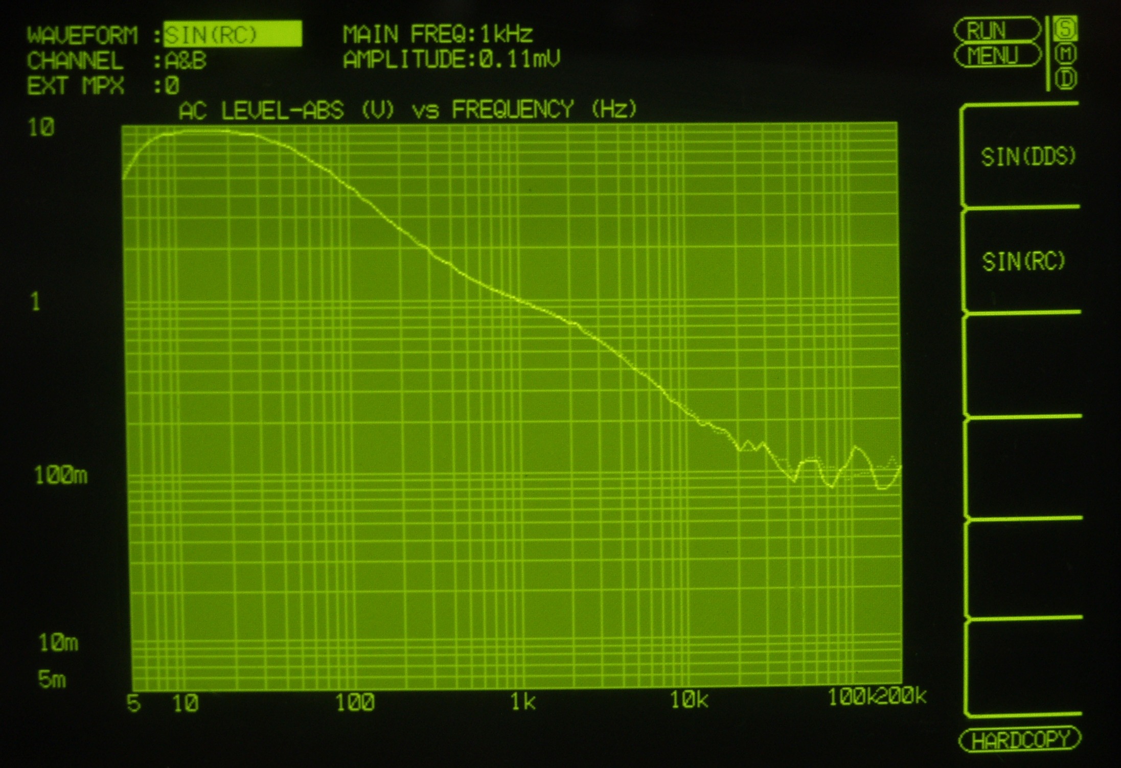 | E1B. 出力=10Vの出力でも飽和しない! 歪み率=0.01% AUX入力 1000HZ このAMPは入力ジャックの抜き差し等は、十分注意する事。ミスをするとメインAMPやSPを壊します。 |