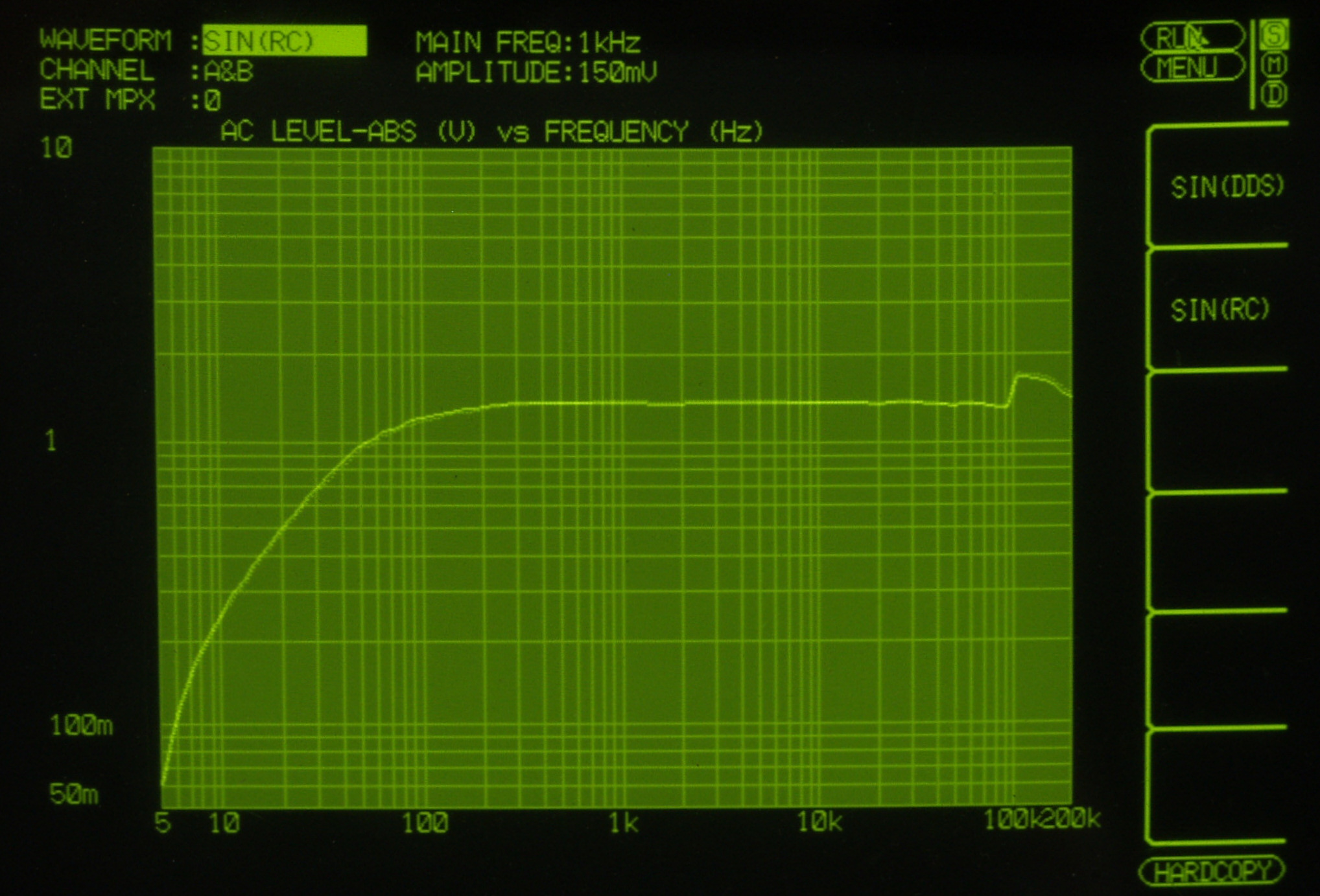 | E41. 出力=15Vの出力でも飽和しない! 歪み率=0.04% MM入力 1000HZ このAMPは入力ジャックの抜き差し等は、十分注意する事。ミスをするとメインAMPやSPを壊します。 |