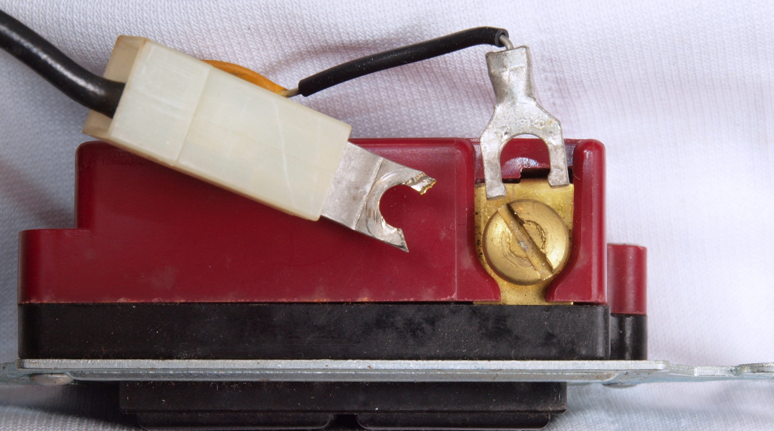 | C88. 修理中 電源SW配線。 Y型圧着端子は切り詰めてある サイドに固定されていない所にY型端子を使用すると、Y型端子が開いてしまうので、使用は注意。 |