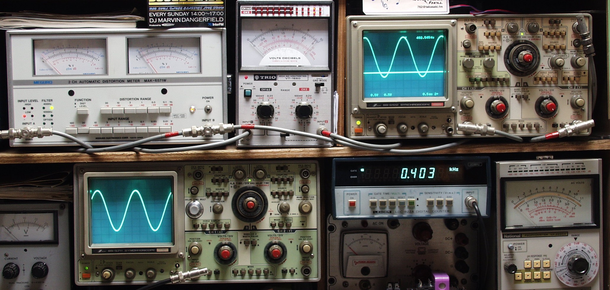 | E. 調整・測定 E1. 出力、歪み調整・測定 電源電圧は100Vにて測定 <見方> 下左のオーディオ発振器より400HZ & 1KHZの信号を出す(歪み率=約0.003%) 下中の測定器−−入力波形(オーディオ発振器のTTLレベル) 下右の測定器−−周波数計 上左の測定器−−SP出力の歪み率測定。 左メータ=Left出力。 右メータ=Right出力 上中の測定器−−SP出力電圧測定器。 赤針=Right出力。 黒針=Left出力 上右の測定器−−SP出力波形オシロ。 上=Right出力。 下=Left出力(出力電圧測定器の出力) |
