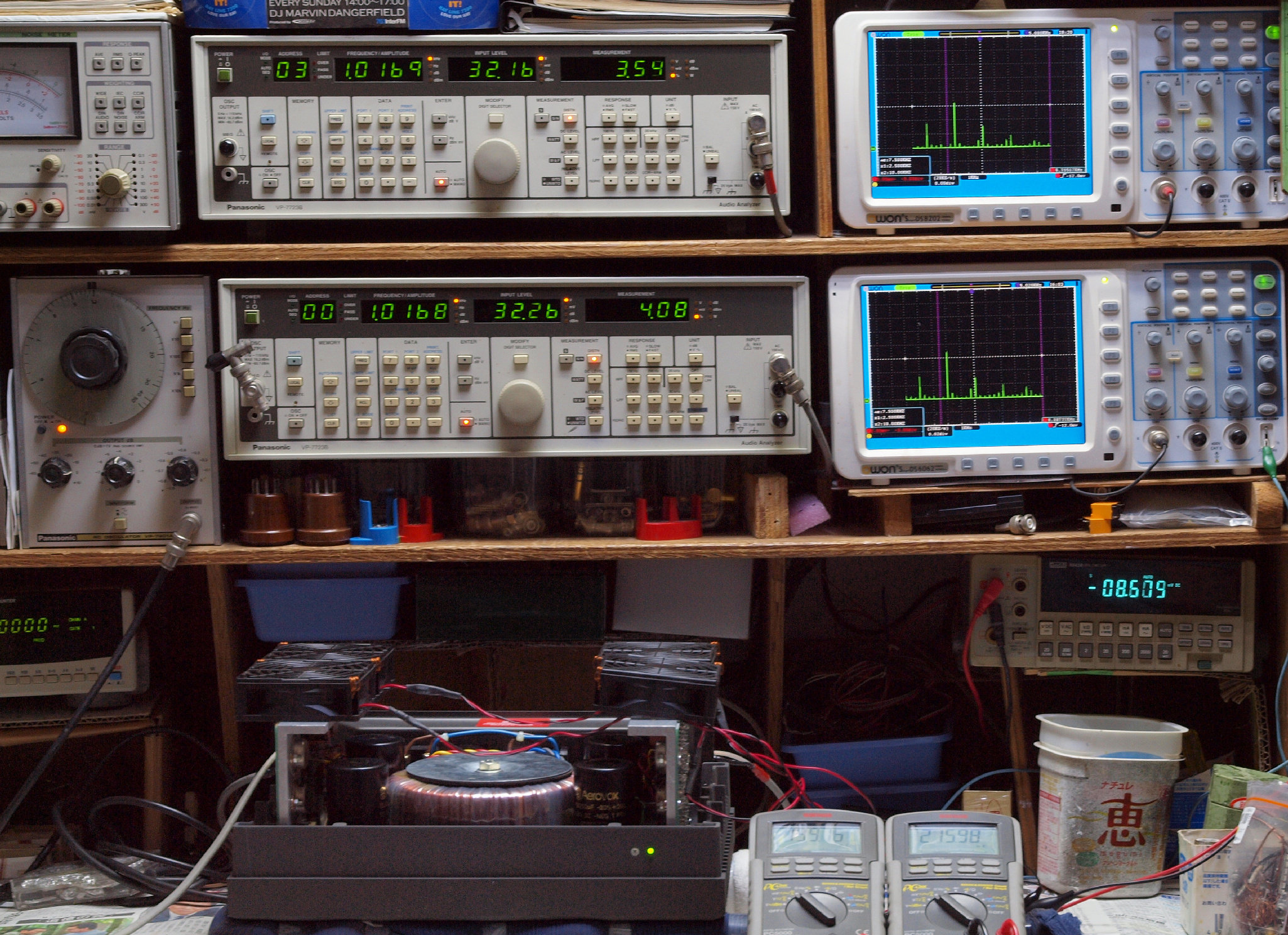 | E. 測定・調整。 画像をクリックすると、大きく(横幅2050ドット)表示されます。 E1. 出力・歪み率測定・調整 「見方」。 上段中 右側SP出力を「Audio Analyzer Panasonic VP−7723B」により測定。 表示LED、 左端=メモリーNo、 中左=周波数測定、 中右=出力電圧測定、 右端=歪み率測定。 上段右端 VP−7723Bの基本波除去出力を「owon SDS8202(200MHZ)」で「FFT分析」表示。 下段中 左側SP出力を「Audio Analyzer Panasonic VP−7723B」により測定。 表示LED、 左端=メモリーNo、 中左=周波数測定、 中右=出力電圧測定、 右端=歪み率測定。 下段右端 VP−7723Bの基本波除去出力を「owon SDS6062(200MHZ)」で「FFT分析」表示。 下段左端 オーディオ発振器 VP−7201A より50Hz〜100kHzの信号を出し(歪み率=約0.003%)、ATT+分配器を通し、AMPに入力。 よって、ダイアル設定出力レベルより低くなります。測定機器の仕様や整備の様子はこちら、「VP−7723B」「VP−7201A」。 FFT画面の見方はこちら。 |