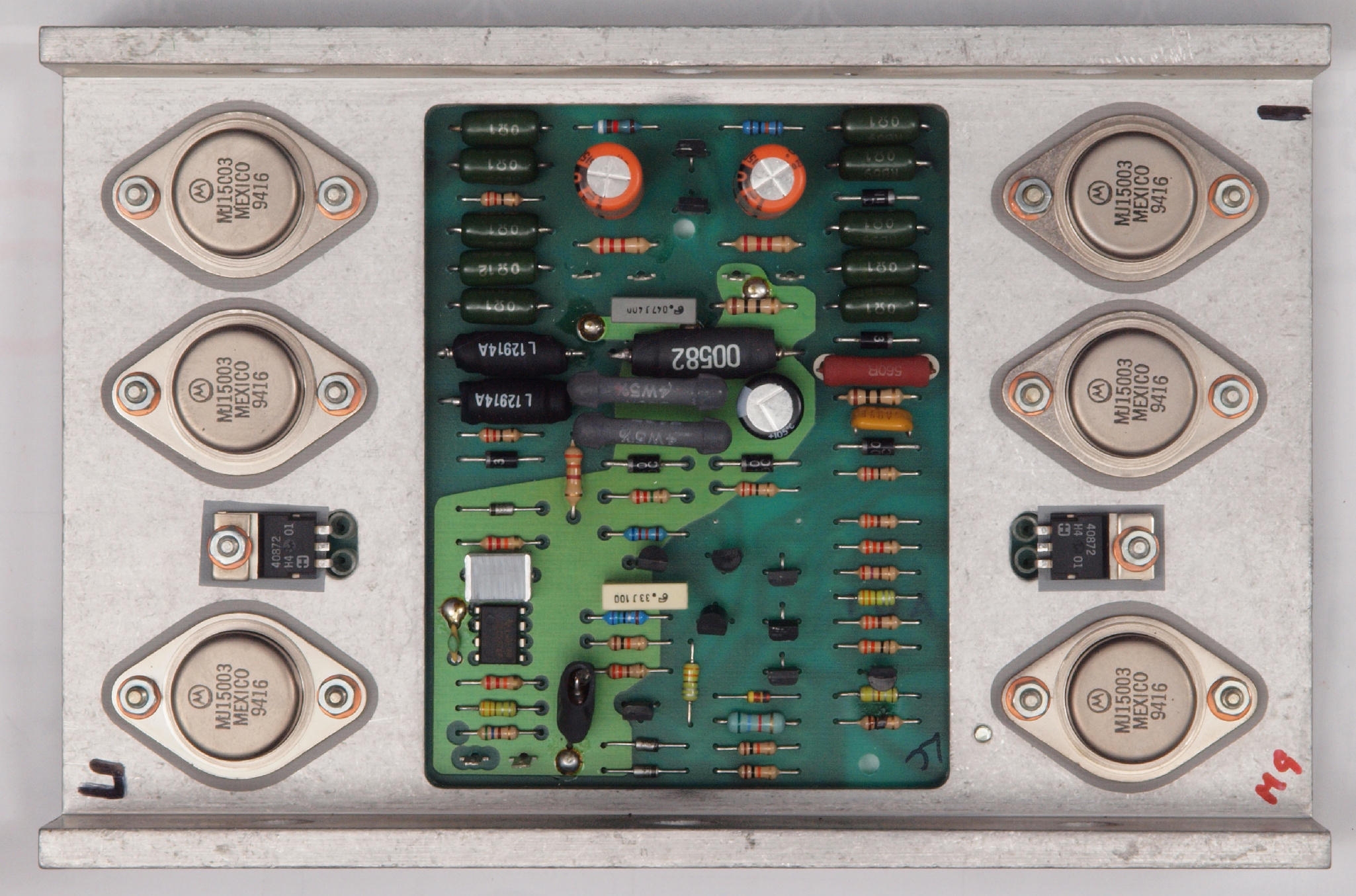 | C112. 修理中 R側AMP基板。 焼けたアース接続抵抗。 電源コードのアース線の回り込みで起こる。 | ||||||||||||||||||||||||||||
