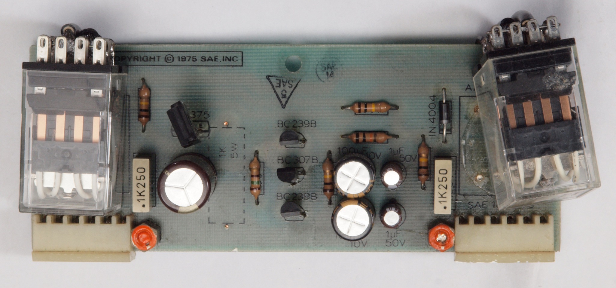 C75. 修理後 プロテクト(リレー)基板。 リレー2個、電解コンデンサー4個。 リレー端子配線は最短距離で行う、除く電流が少ないコイル配線。