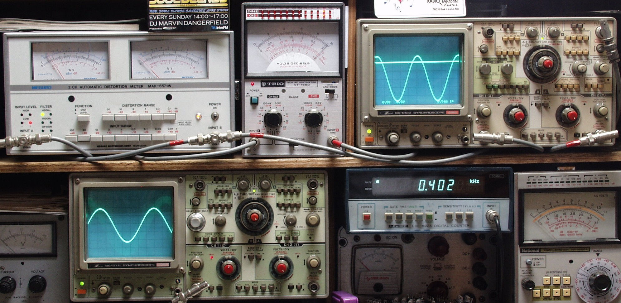 | E. 調整・測定 E−1. 出力/歪み率測定・調整 <見方> 下左オーディオ発振器より400HZ&1KHZの信号を出す(歪み率=約0.003%)。 下中=入力波形(オーディオ発振器のTTLレベル)。 下右=周波数計。 上左=SP出力の歪み率測定。 左メータ=L出力。 右メータ=R出力。 上中=SP出力電圧測定器。 赤針=R出力。 黒針=L出力 上右=SP出力波形オシロ。 上=R出力。 下=L出力(出力電圧測定器の出力)。 |