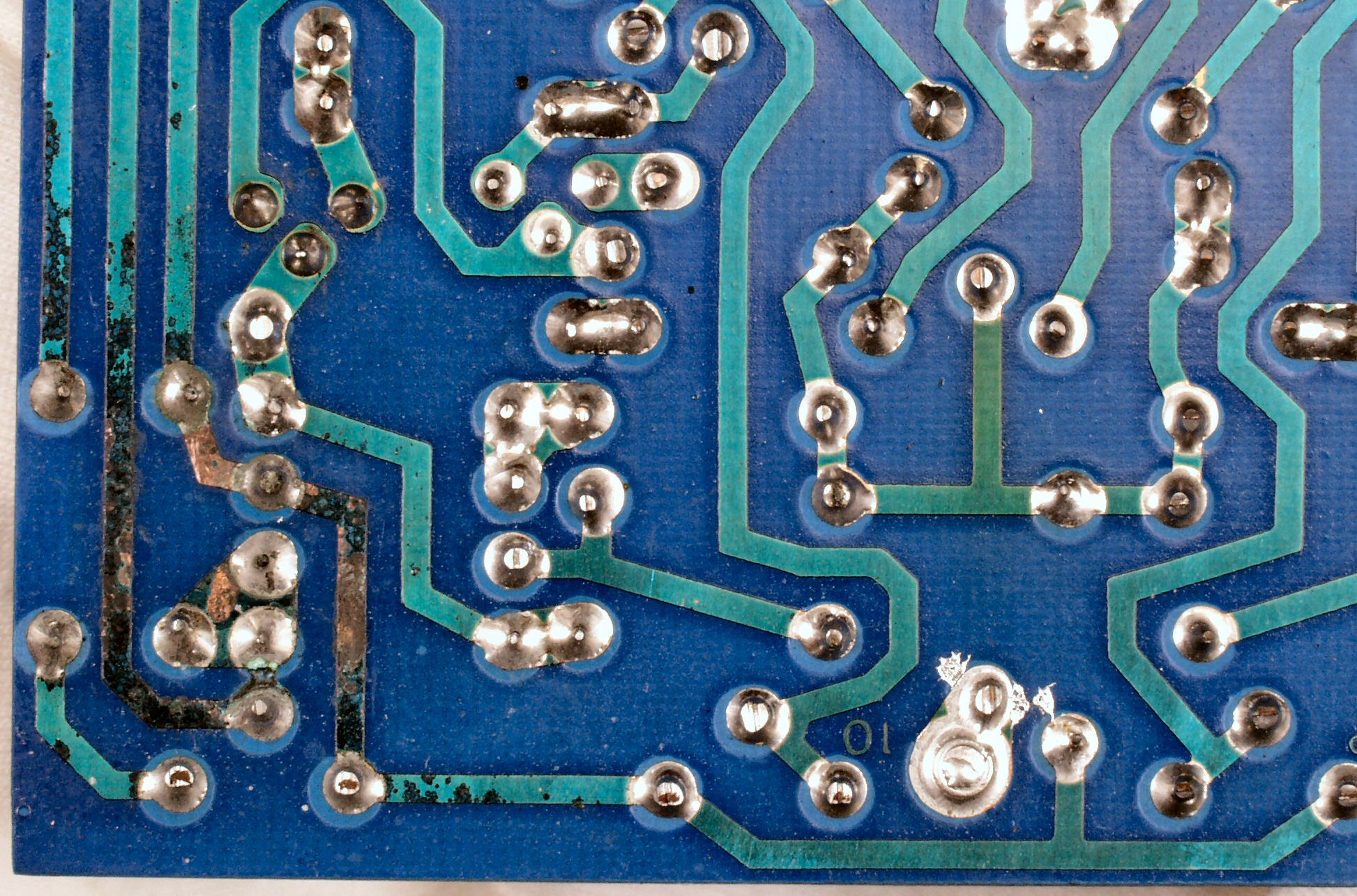 | C−4C−1. 修理前 VU基板裏 接点復活剤の使用で腐食した銅箔、右下はは半田屑が付いている | ||||||||||||||||||||||||||||||