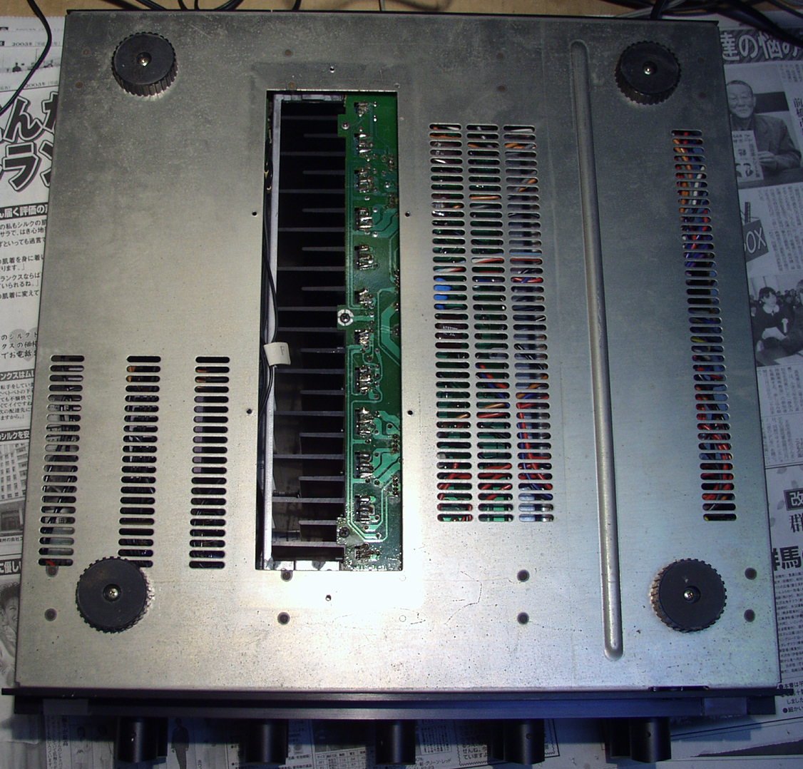 真ん中にあるメインAMP基盤は終段TR(トランジスタ−)を外さないと取り出せない