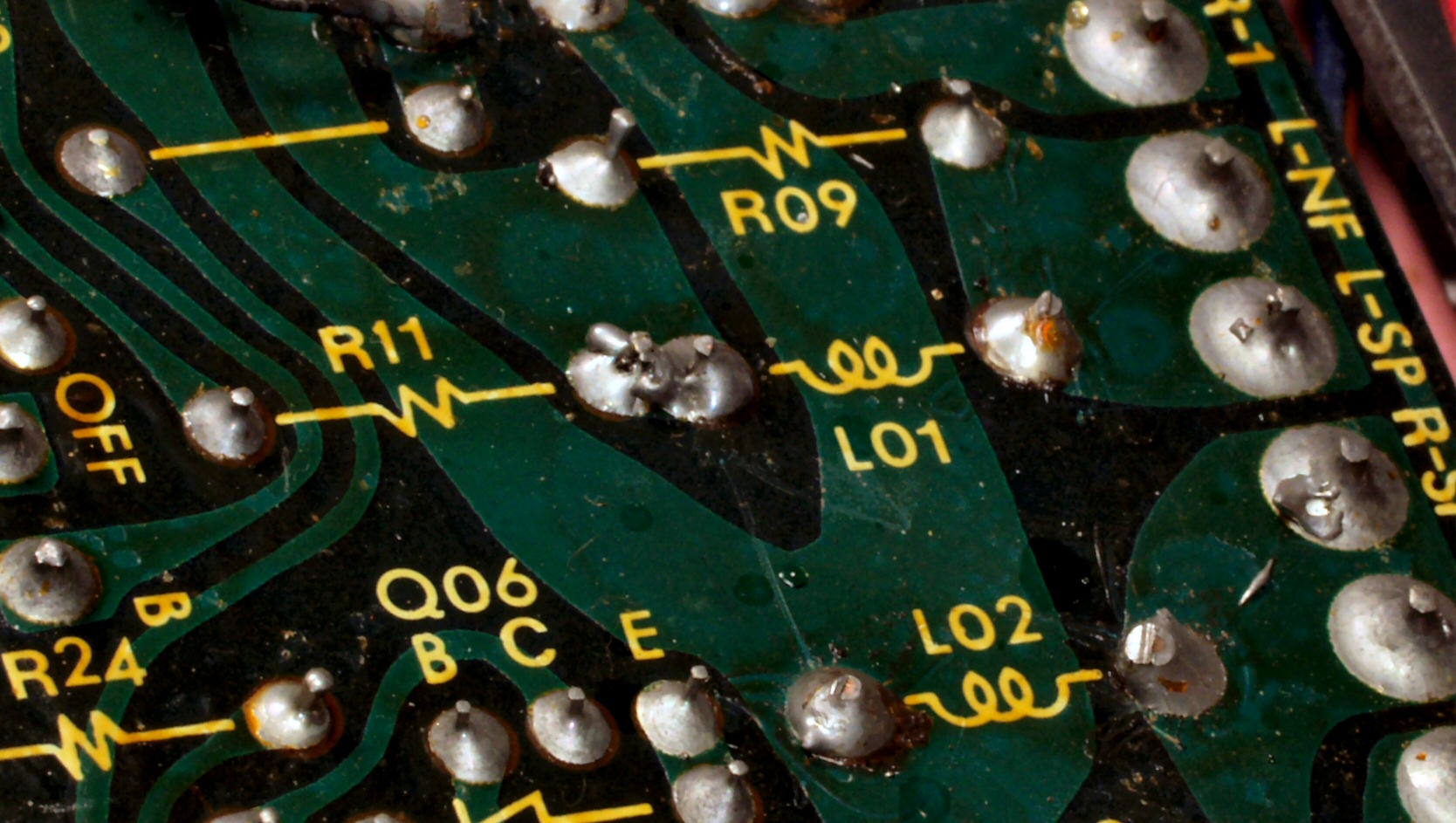 | A52. 点検中 R−AMP基板裏、交換したTR(トランジスター)のリードの半田! | ||||||||||||||||||||||||||||||||||||||||||||||