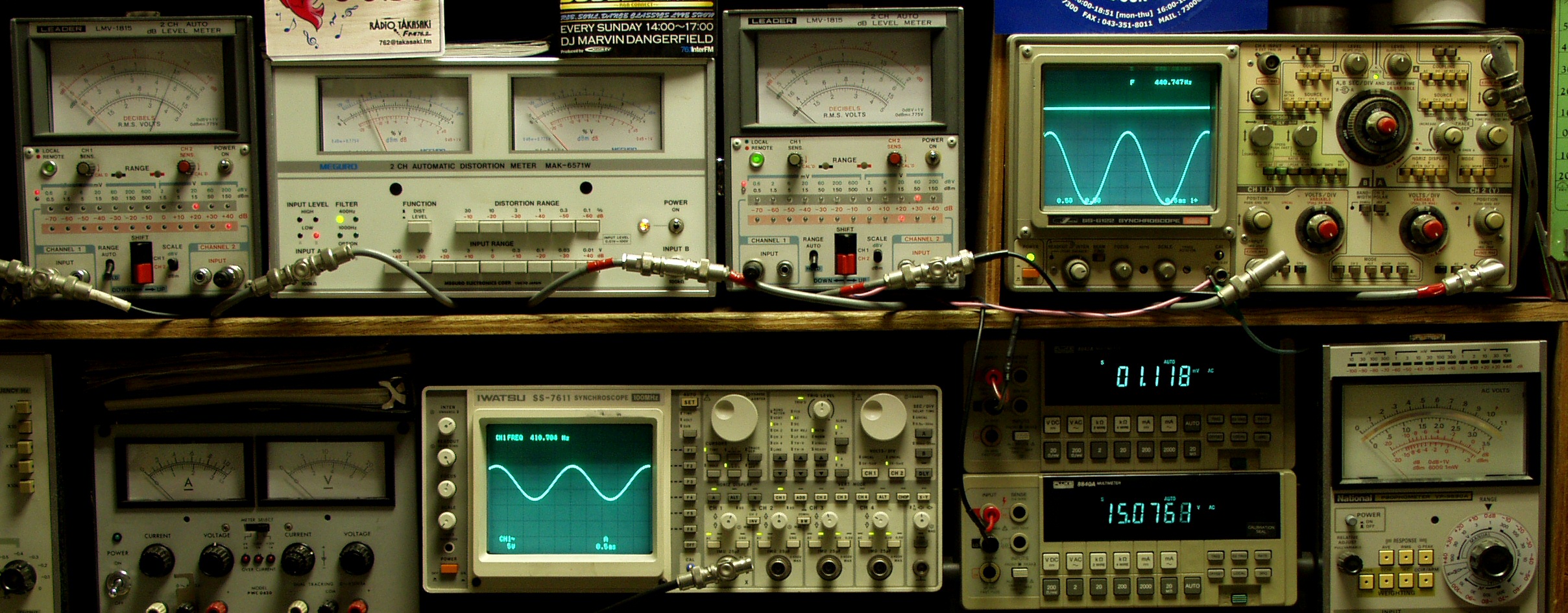 | T. 修理前点検測定 T1. 出力・歪み率測定 <見方> 下段左端 オーディオ発振器より400HZ・1KHZの信号を出し(歪み率=約0.003%)これをAMPに入力し、出力を測定 下段中左 オシロ=入力波形(オーディオ発振器のTTLレベル) 下段中右上=周波数計 上段左端 電圧計=L側出力電圧測定、黒針のみ使用 上段中左 歪み率計=出力の歪み率測定 左メータ=L出力、右メータ=R出力 上段中右 電圧計=R側出力電圧測定、赤針のみ使用 上段右端 オシロ=出力波形 上=R出力、下=L出力(実際にはRL電圧計の出力「Max1V」を観測) 下段中右上 デジタル電圧計=R出力電圧測定 下段中右下 デジタル電圧計=L出力電圧測定 |